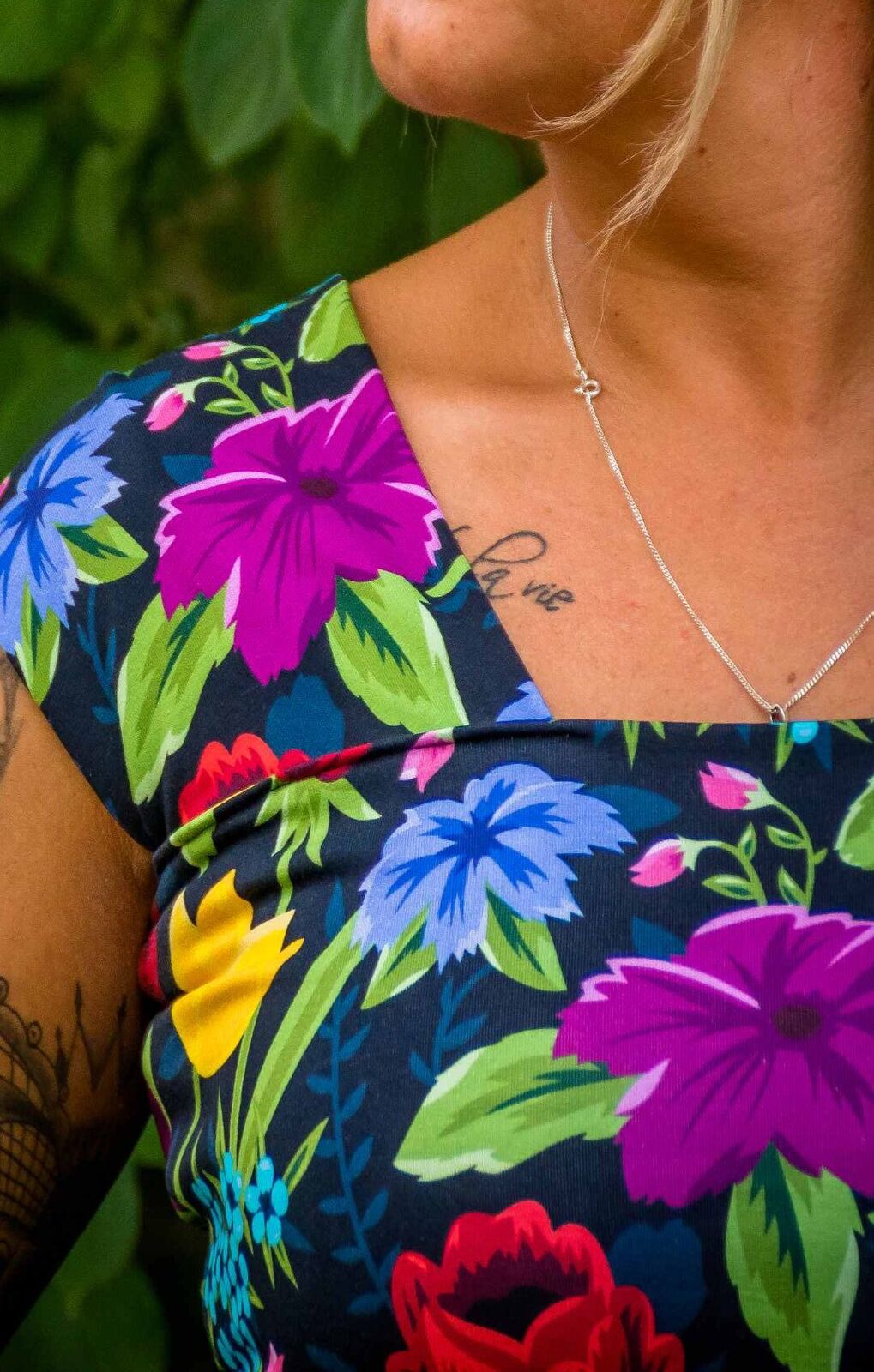 „La Danse Des Fleurs“ ist Jersey mit einem Baumwollanteil von 95% sowie 5% EL. Durch den Digitaldruck entsteht – wie bereits oben erwähnt, diese Farbbrillianz sowie eine sagenhafte Detailgenauigkeit.