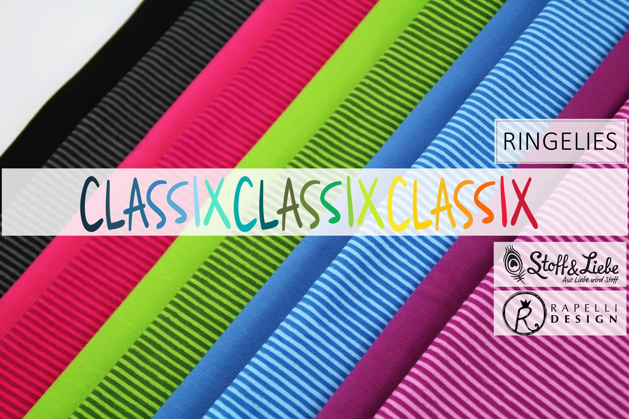 Die tollen Ringelies in den Farben „Blue“, „Black“, „Pink“, „Berry“ & „Green“, sind nicht nur einzeln vernäht und verziert ein Hingucker. Ebenso passen sie zu zahlreichen S&L-Designs und auch hervorragend zu einiger unserer Classix!-Designs.