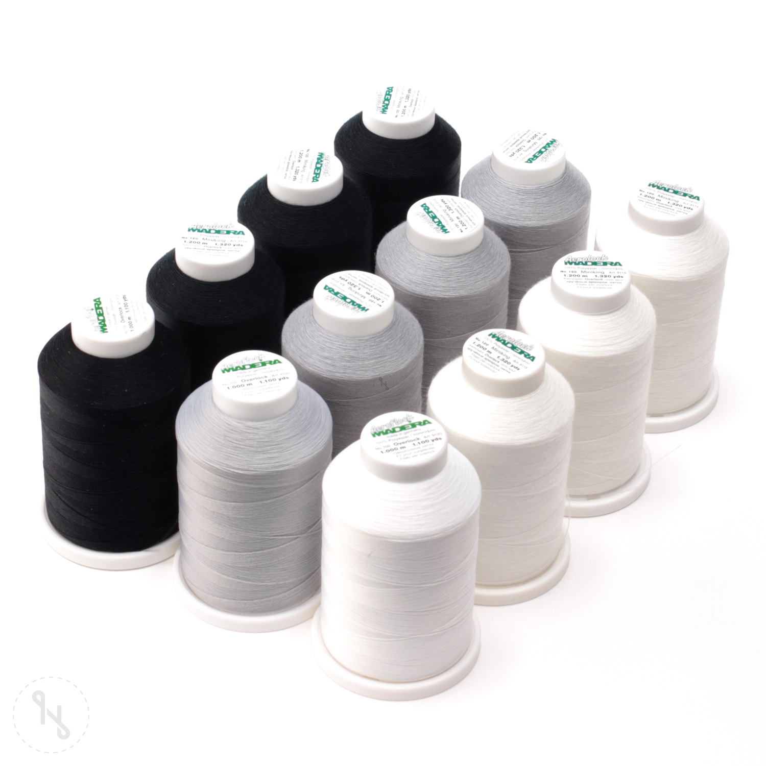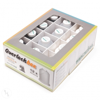 Die Overlockbox von Madeira enthält jeweils 3x das Aerolock 125, 1200 m Overlockgarn in den Farben 8000, 8020 und 8100. Außerdem ist jeweils 1x Aeroflock 100, 1000 m Bauschgarn in den Farben 8000, 8020 und 8100 enthalten.