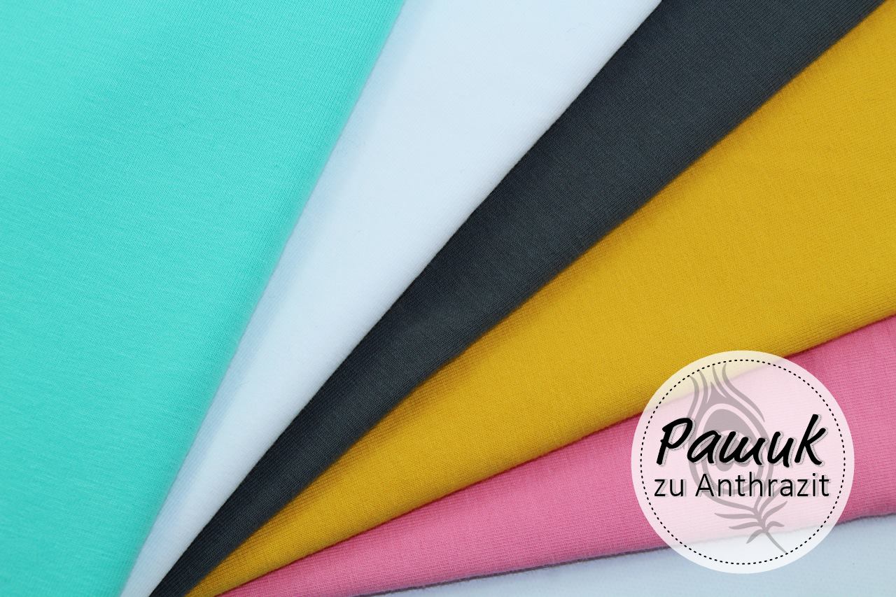 Pamuk-Empfehlung zu „Pavo Anthrazit“: Mint 318 / Weiß 100 / Dunkelgrau 820 / Dunkelgelb 201 / Rosa 610