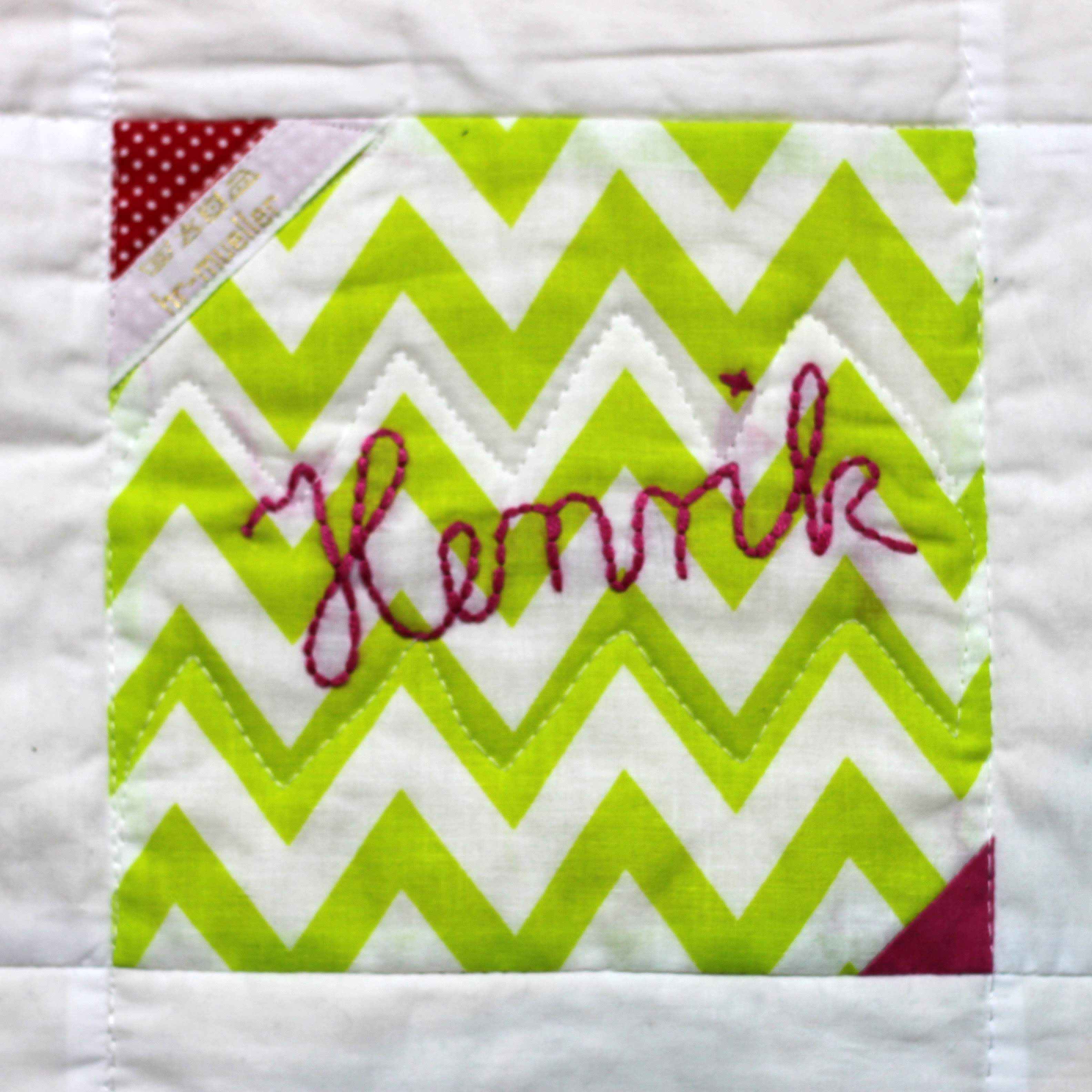 Parallel zu meinem „City Sampler Quilt“ habe ich 49 Quadrate zugeschnitten und eins an jedes Familienmitglied geschickt mit der bitte, es zu gestalten und an uns zurück zu schicken.