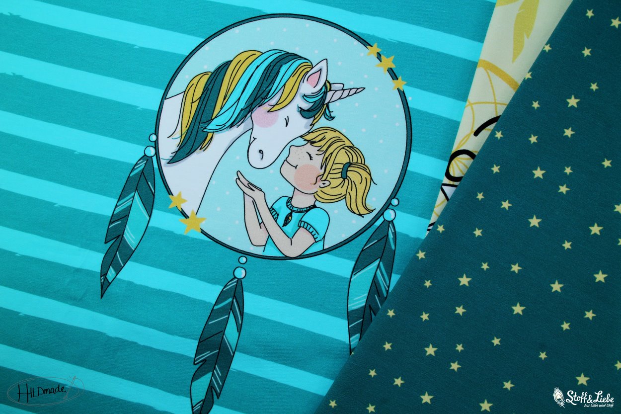 Ein ganz bezauberndes Design für „süße“ und schöne Träume, auch für Tagträumer beim Spielen oder Toben. Dieses süße Design ist nicht nur für Träumer, sondern auch für alle „Einhorn-Liebhaber“ ganz wundervoll. Dieser tolle, weiche Jersey, lässt sich super in einen Schlafanzug, Schlafkleidchen, Spieler, Shirt, Kleid oder welche Ideen du auch immer hast, verwandeln.