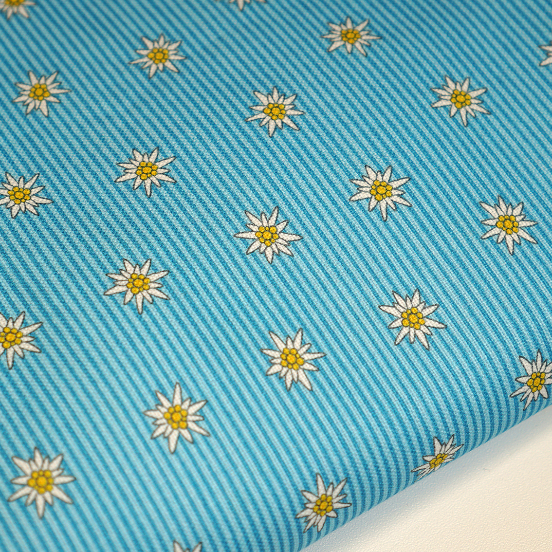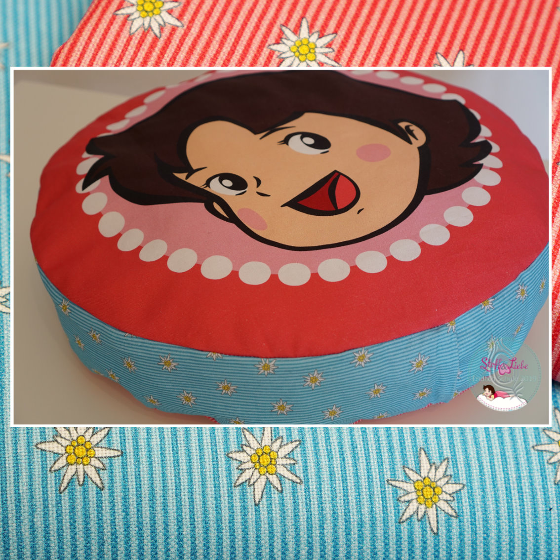 Das Heidi – Kissen – Panel hat auf einer Höhe von ca. 75 cm einige Kissen-Schnitteile parat. Das abgebildete Sitzkissen beispielsweise hat einen Durchmesser von ca. 45 cm, dies ist auch die Höhe der Heidi Figur. Das rechteckige Kissen ist ca. 40 x 60 cm. Wunderbar passend für die Rückseiten der Kissen oder auch solo für eine Tasche oder andere schöne Projekte sind die Kombistoffe „Edelweiß„.