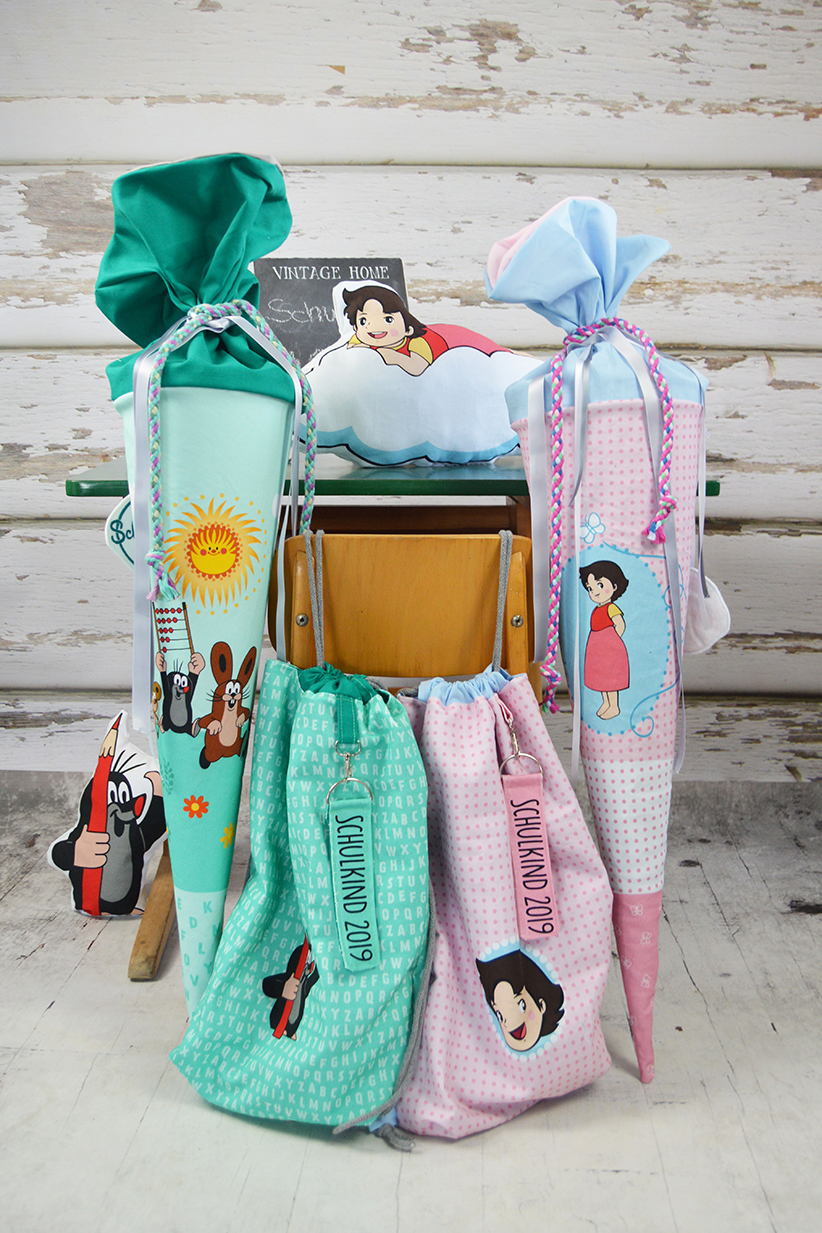 Die Schulkind-Panele beinhalten einen Schultüten-Schnitt für den großen Schultüten-Rohling (ca. 70cm), einen Turnbeutel-Schnitt (fertiges Maß ca. 32 x 48 cm), ein Kissen-Schnitt und einige Applikationen um Eure Schultüte zu individualisieren.