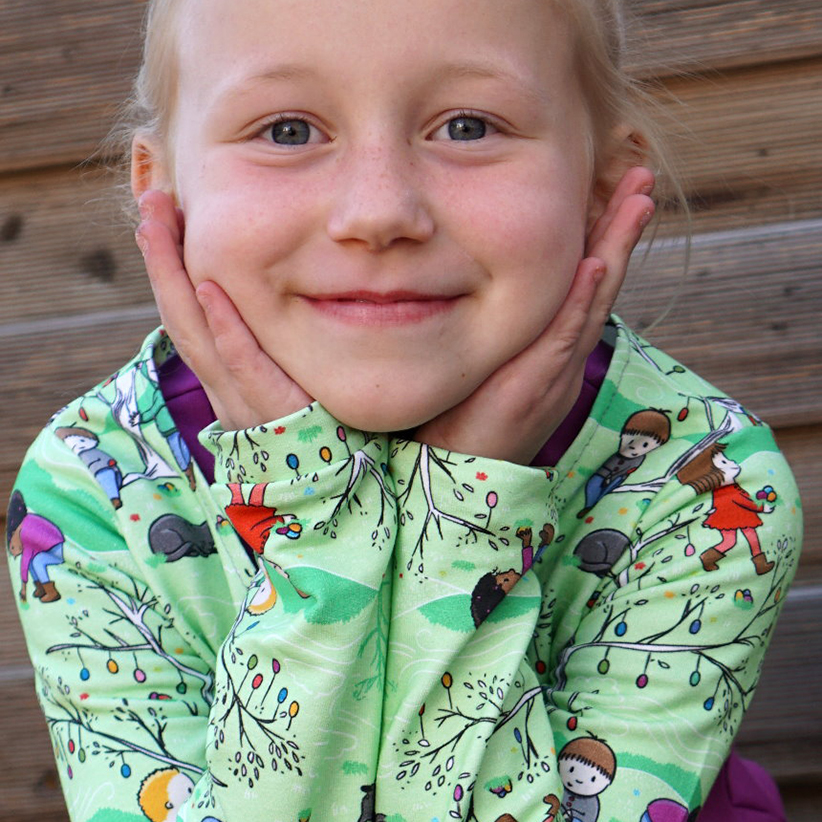 er ist nicht viel dicker als Jersey, er trägt sich so herrlich angenehm, nicht zu vergleichen mit einem angerauten Sweat! Gerade wenn die Kids draußen auf der Wiese rumtoben am frühen Morgen ist es ja auch noch etwas frisch an Ostern, oder am Abend im Sommer, ein leichtes Sweatshirt eben 😉