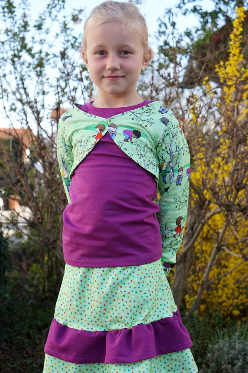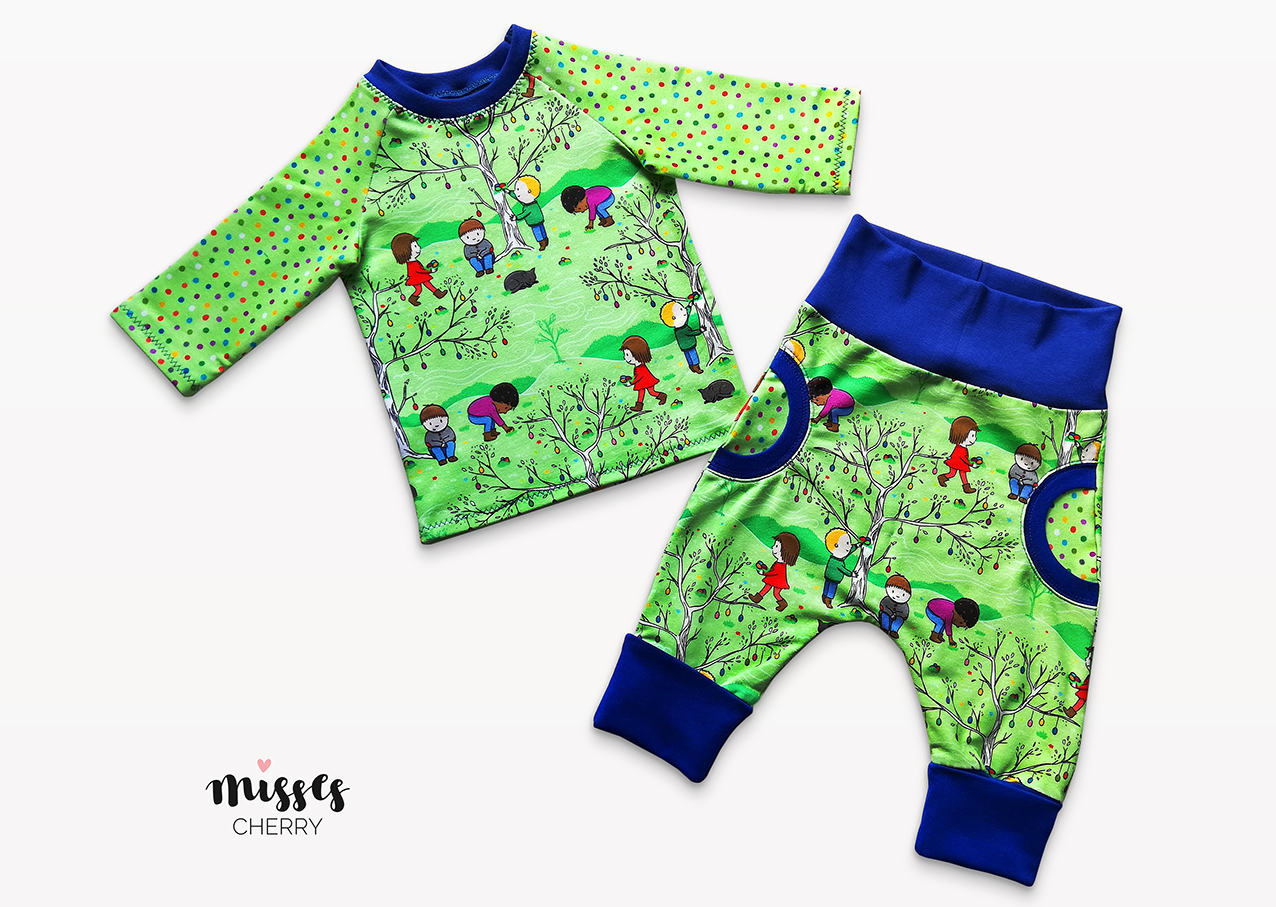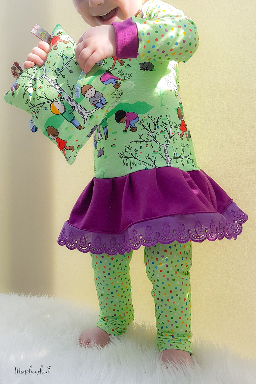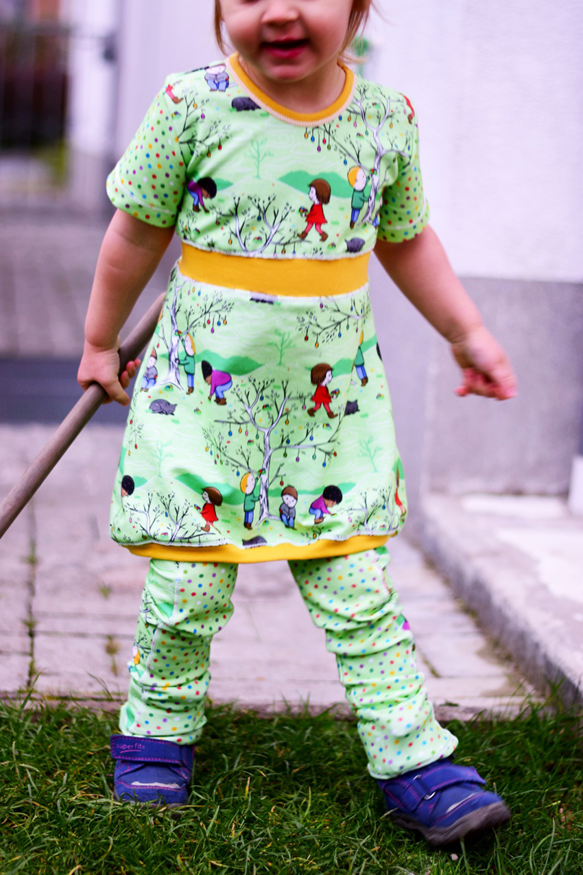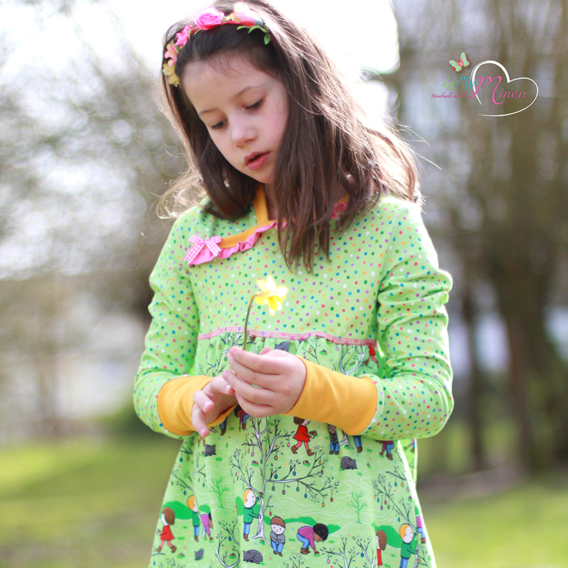 Wir genießen die ersten Sonnenstrahlen des Frühlings und freuen uns über das schöne Wetter und die Wärme. Die ersten Sträucher und Blumen blühen, da lacht das Herz. Da wird es auch bei uns direkt etwas frühlingshafter. Wir denken an Ostern und freuen uns schon, wie die Kinder in den Gärten die Ostereier suchen. Rapelli Design hat für uns passend für diese Jahreszeit einen super goldigen Stoff designed. Angelehnt an die Laternenkinder wollten wir auch fröhliche Kinder im Frühling haben. Die passenden Punkte sind super zum Kombinieren geeignet.