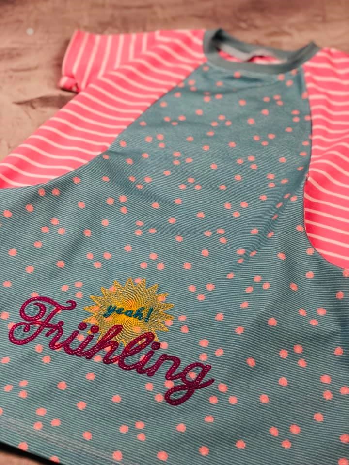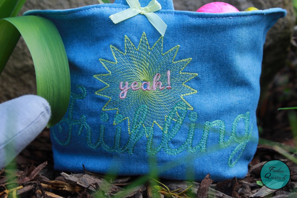 Den Schriftzug „Frühling“ und die Sonne mit dem Schriftzug „Yeah!“ bekommt ihr auch separat als einzelne Stickdateien. Diese werden ganz genau wie oben beschrieben gestickt.