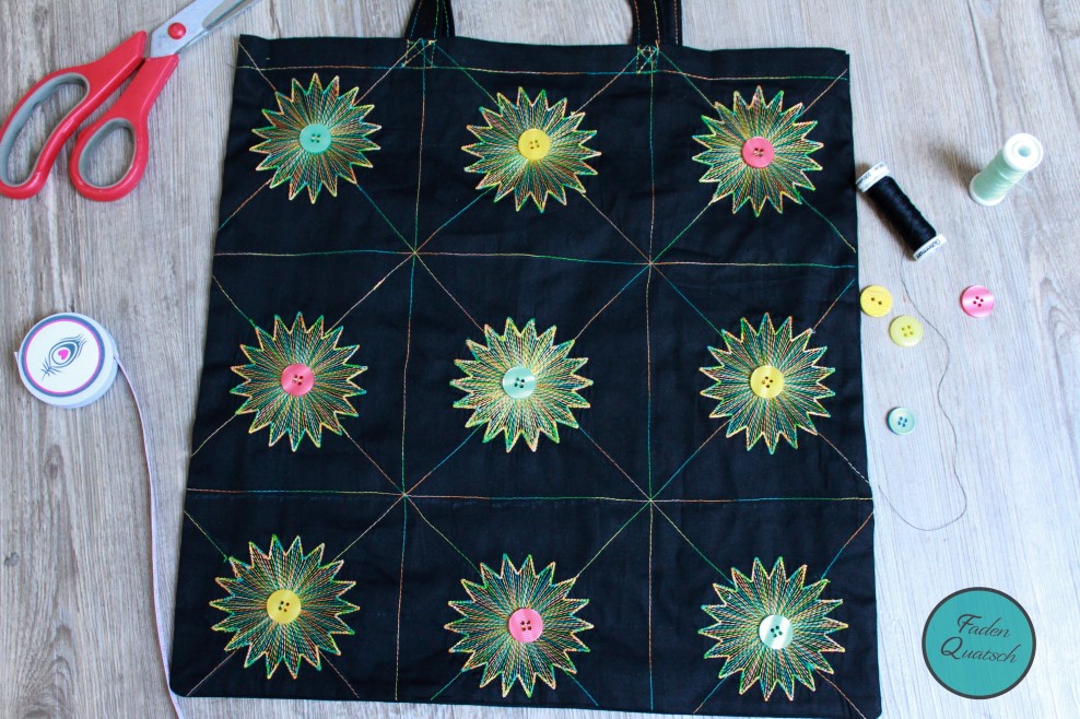 Die Mylar® Stickfolie ist maschinenwaschbar und glitzert unter den locker digitalisierten Stichen, als ob man mit Metallicgarnen gestickt hätte. Je nach Lichteinfall und welche Farben der Hintergrund Stoff und das Garn haben, schimmert die Stickerei ganz schön. Solche Stickereien sind in den USA schon lange Trend. Davon möchte ich Euch heute mal ein klein wenig abgeben!