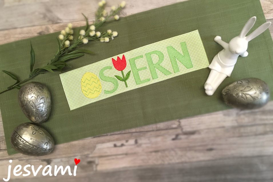 Mein Tipp: Wenn Du ohne Stickfolie arbeitest kannst Du unter der Sonne einfach Stoff unterlegen und das Ganze als Fransenapplikation (Doodle) arbeiten. Dasselbe kannst Du bei der Sonne in der Stickdatei unten sowie bei dem „Ostern“ Schriftzug machen.