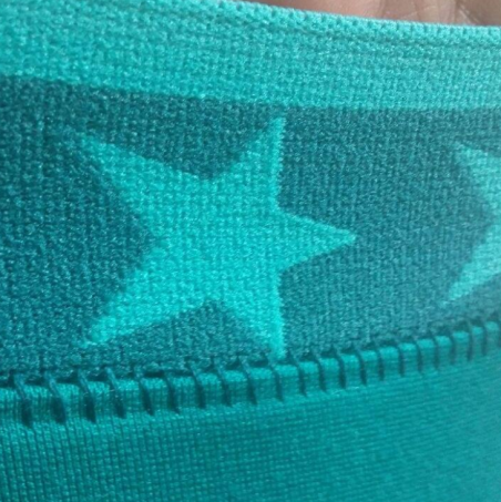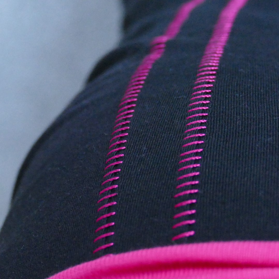 Ich möchte zunächst eine eigentlich ganz schlichte Laufhose nähen, in schwarz, das geht immer. Verwendet habe ich hierfür den herrlichen Pamuk Bio-Jersey in schwarz und das Pamuk Bio-Bündchen in Pink. Sie fassen sich herrlich weich an und sind für dieses Projekt bestens geeignet. Mit Stickereien hab ich es gerade nicht so. Einen Plotter hab ich leider nicht. Allerdings bin ich Nahtfetischist, darum entscheide ich mich für die Flachnaht als äußere Hosenbeinnaht. Weil Streifen gerade so hipp sind, lege ich einfach einen zweiten direkt daneben. Da diese jetzt mittig durch den Stoff geht, muss ich natürlich markieren, ob ich auf dem Vorderbein nähe oder auf dem Hinterbein. Gaaanz wichtig – ich nähe knapp am Messer vorbei, denn ich will ja nicht meinen Stoff zerschneiden ;o)