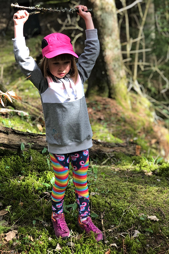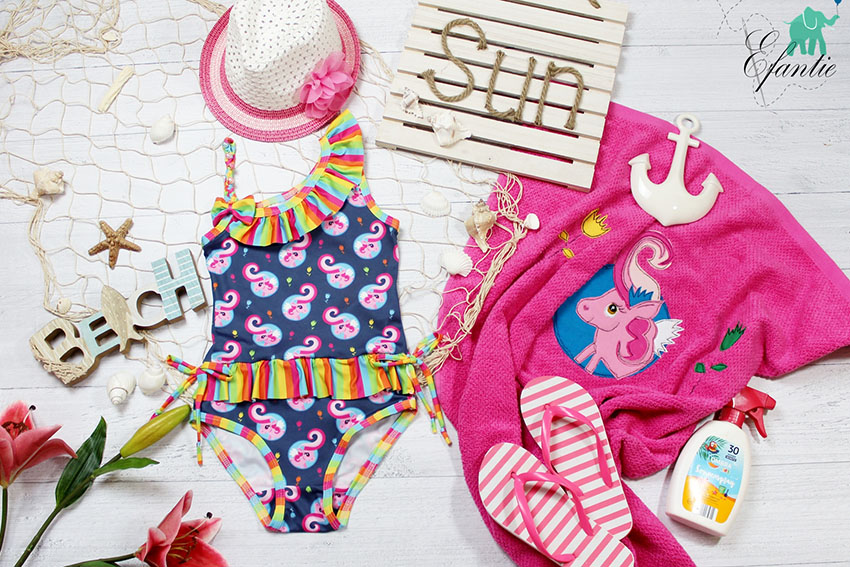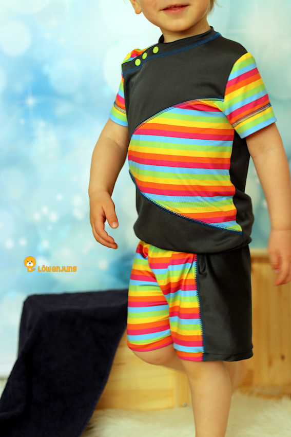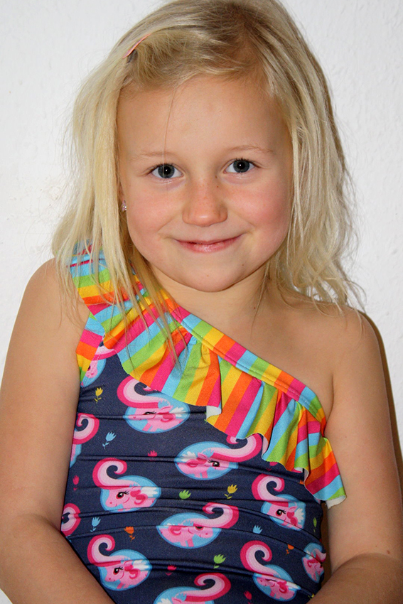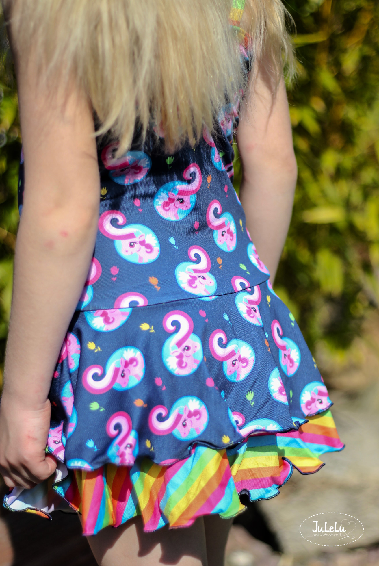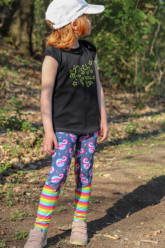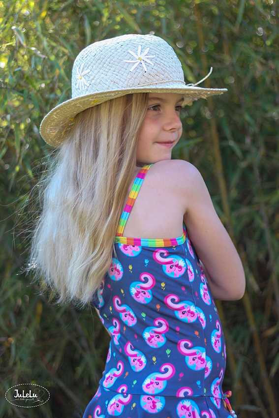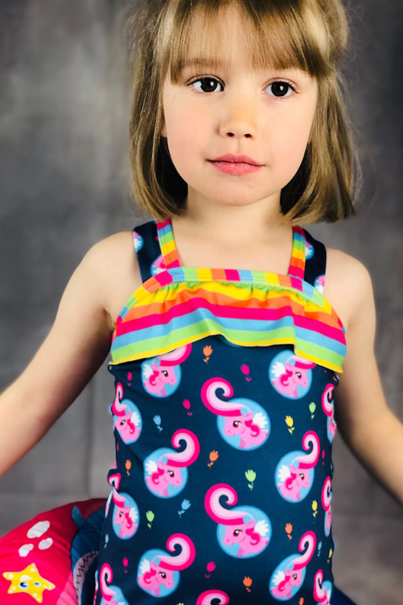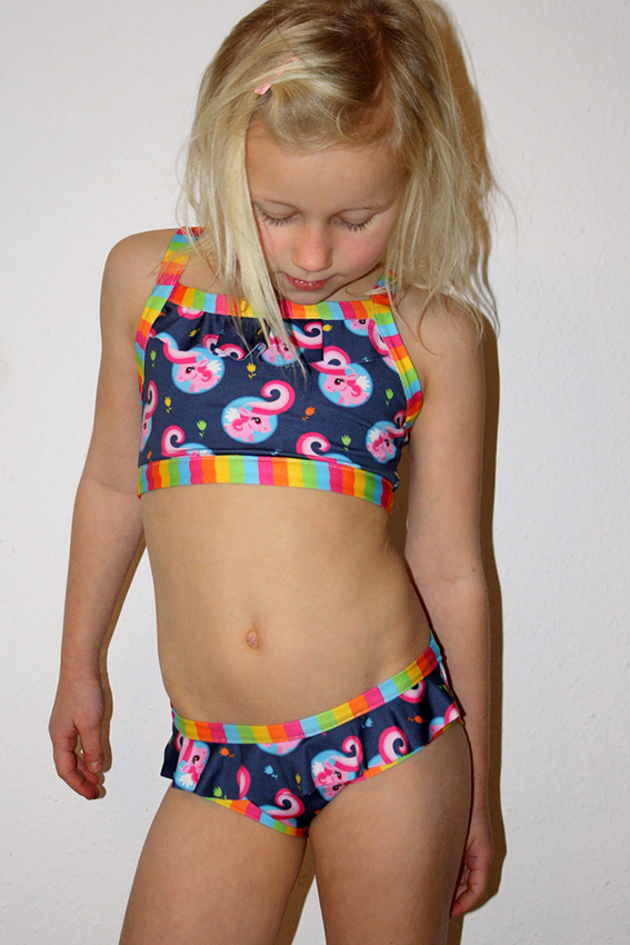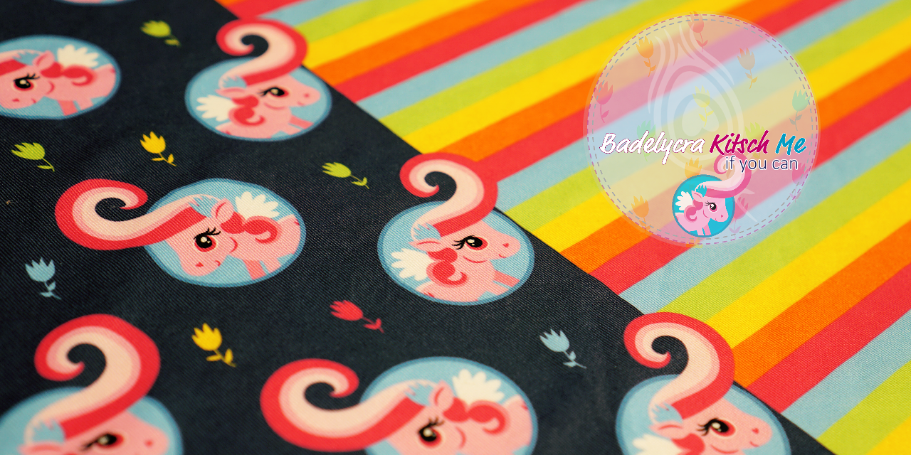 Der Stoff ist zweigeteilt, ähnlich wie ein Panel. Eine Hälfte besteht aus Kitsch Me If You Can-Pony und die andere Hälfte aus den fantastischen Rainbow Stripes, somit habt Ihr direkt beide Stoffe in einem. Jeder kann ganz wunderbar einzeln vernäht oder aber auch toll kombiniert werden. Wir wäre es zum Beispiel mit einem Badeanzug, Badekleidchen, Bikini oder Badeshirt, Sporthose, alles das ist mit diesem tollen Badelycra möglich.