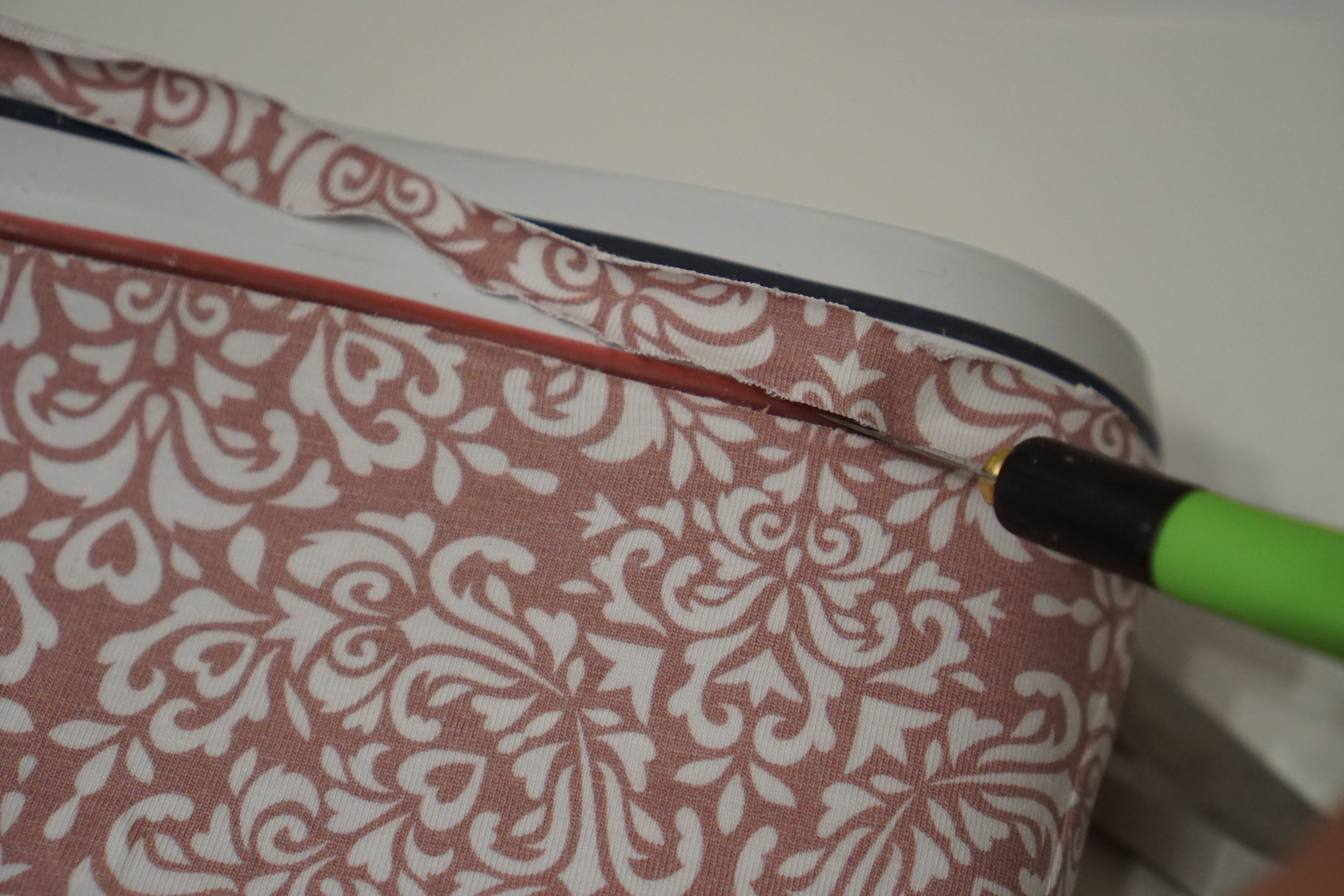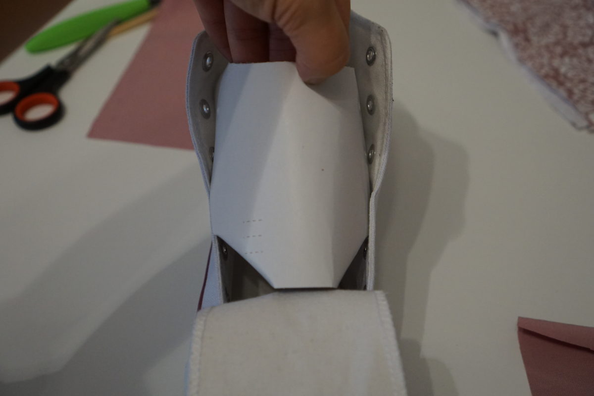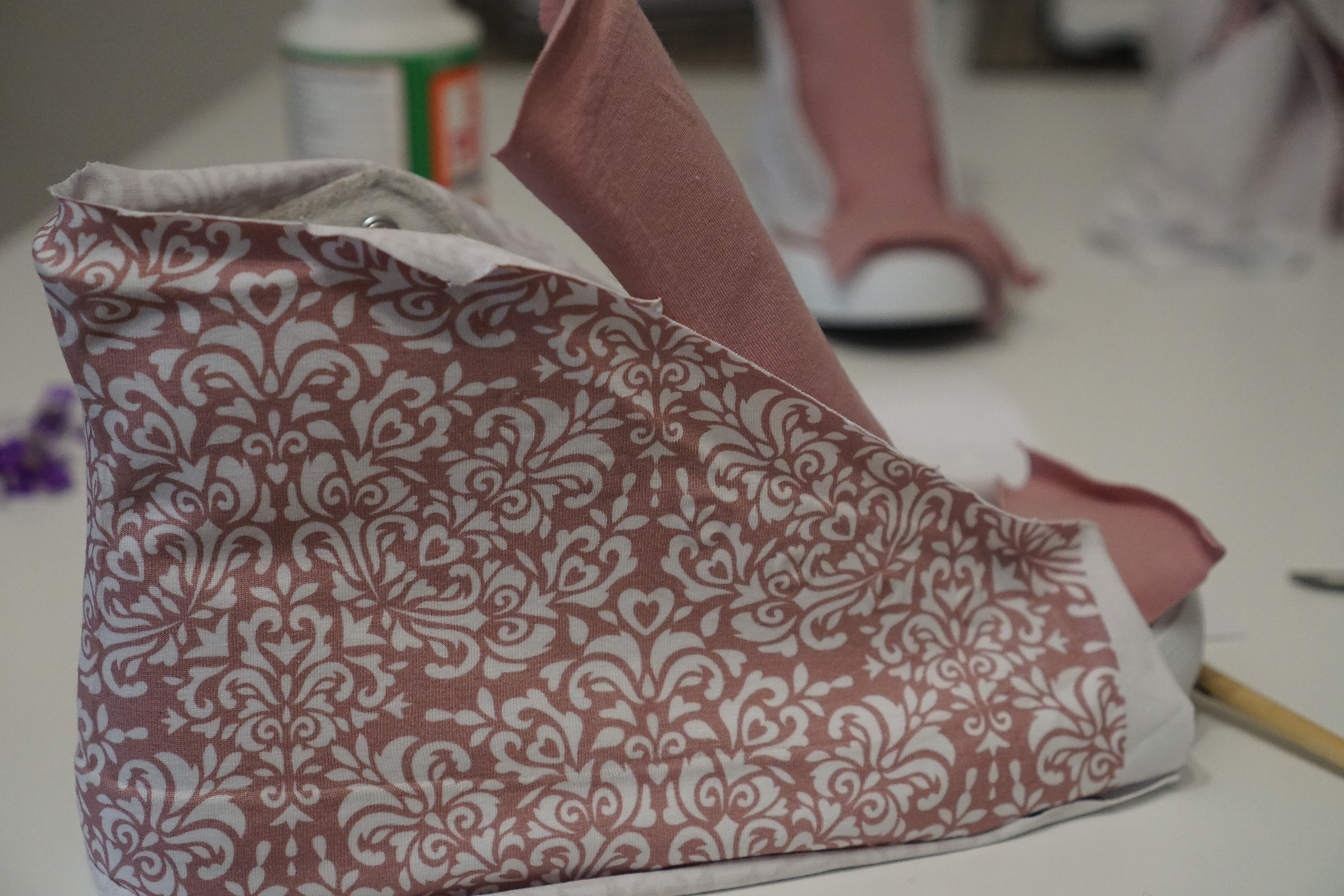 Am besten arbeitet man in kleinen Schritten von 5-10cm … damit man nicht ins schwitzen kommt, wenn irgendwas doch nicht ganz so hinhaut … und man noch etwas Zeit braucht um den Stoff schön an den Schuh anbringen zu können …