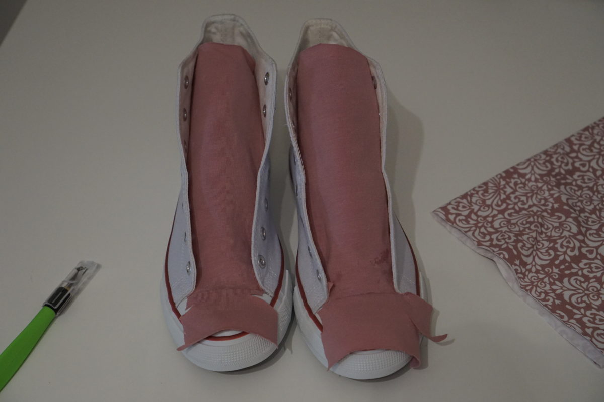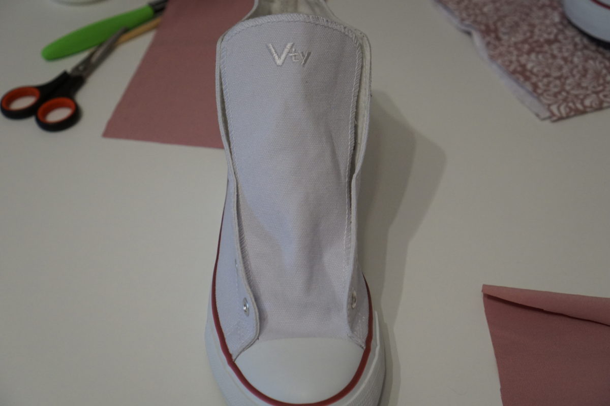 Wenn der Stoff mit dem Kleber am Schuh gut getrocknet ist, wird vorsichtig der Stoff an der Zunge ringsum mit einer scharfen Schere zurecht geschnitten Wenn beide Schuhzungen fertig sind … geht es mit Wunschstoff ringsum den Schuh herum …