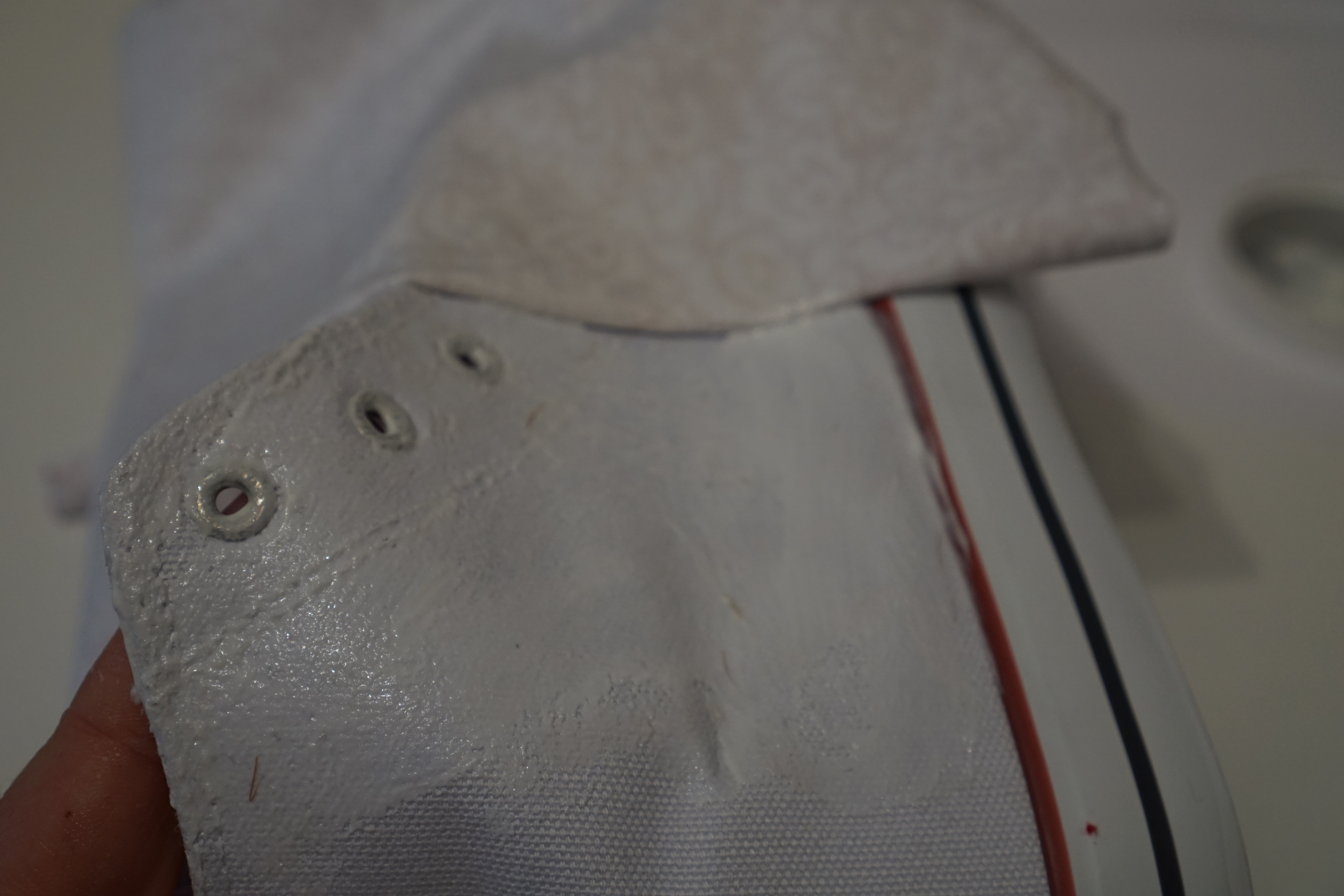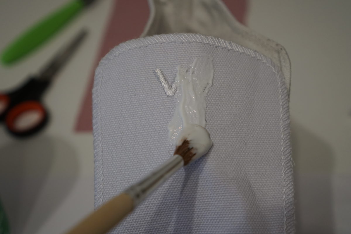 Das Skalpell kommt zum Einsatz … sobald der Stoff am Schuh getrocknet ist … und es kann nun der Stoff scharfkantig abgeschnitten werden.