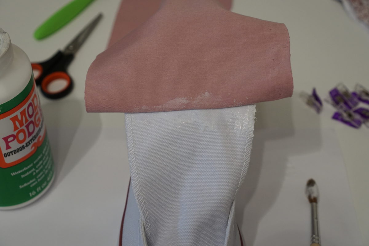Auch hier gilt wieder erst den Kleber drauf (in 5-10cm Schritten) … dann den Stoff anlegen … schön festdrücken … und anschließend am Schuh entlang streichen …