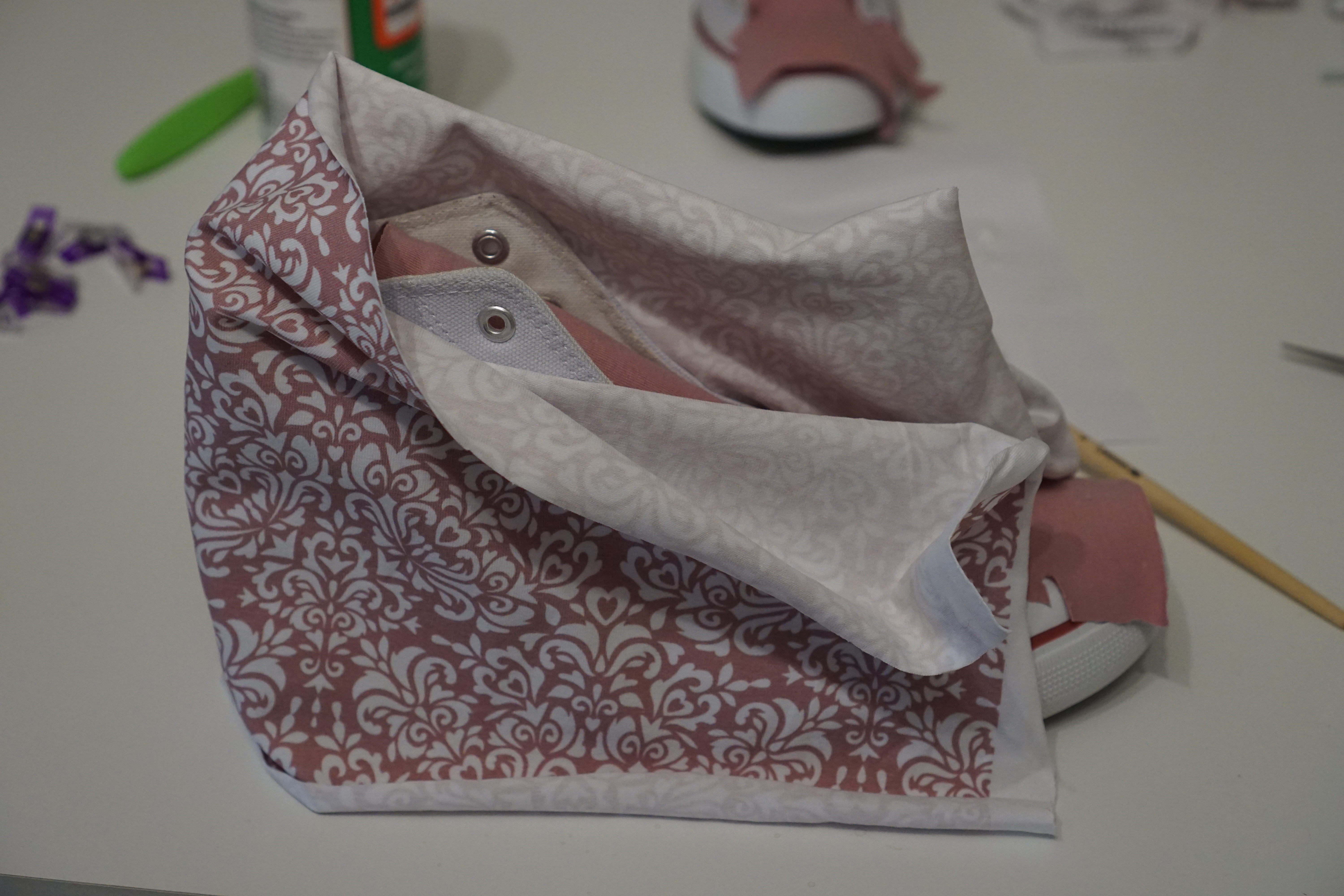 Beim Schuh selbst kann man nun je nach Wunsch den Stoff am oberen Rand mit Kleber nach innen legen … oder knappkantig am Schuhrand mit einer scharfen Schere abschneiden.