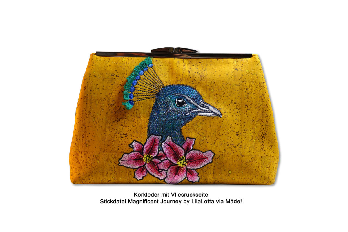 Korkleder: Korkleder mit einer Vliesrückseite funktioniert sehr gut. Wenn es ohne Vliesschicht ist, muss gut stabilisiert werden. Je nach Stickmuster besteht die Gefahr, dass das Material brüchig wird.