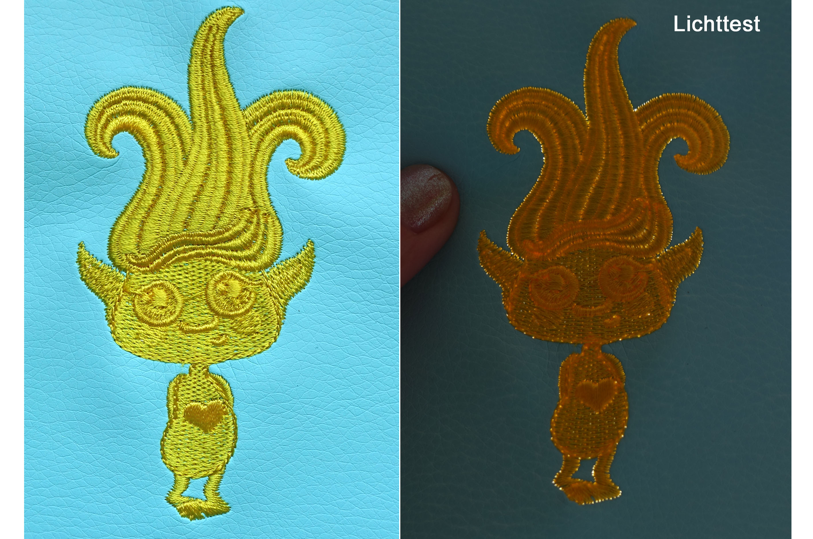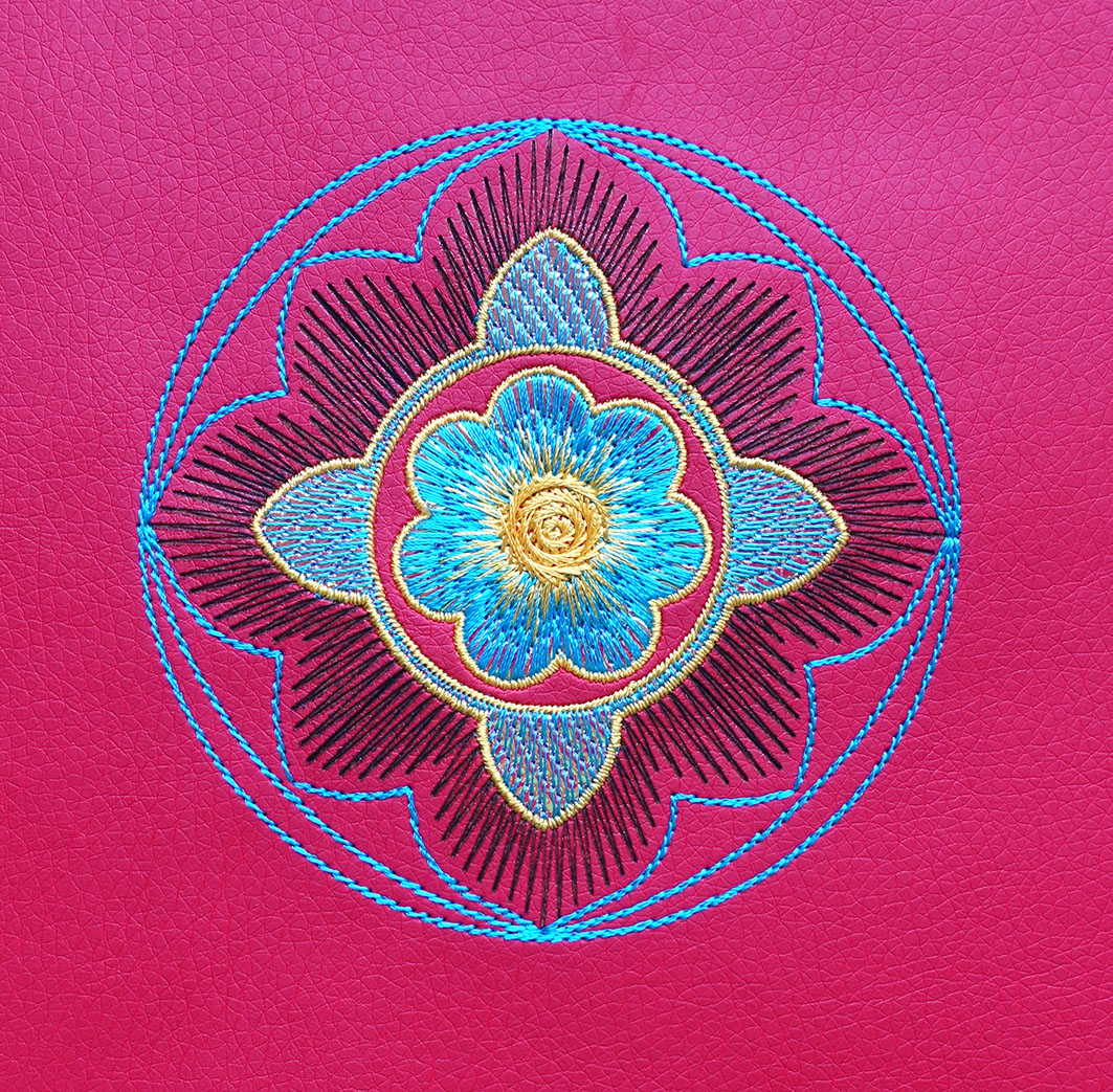 Alle drei Materialien beim Sticken perforieren, wobei im schlimmsten Fall die Stickerei komplett aus dem Material abgetrennt werden, respektive nach kurzer Benutzung ausreißen kann. Die Löcher, welche durch die Nadeleinstiche entstehen, „verheilen“ nicht so wie wir es bei Baumwollgewebe kennen. Aus diesem Grund sind sehr dichte Stickmuster für diese Stoffe nicht so gut geeignet. Es ist durchaus möglich, dichtere Muster auf diesen Materialien zu sticken. Je nach Beschaffenheit des Materials und der Dichte der Stickdatei bleibt natürlich ein Risiko des Misserfolges. Wenn Du in dieser Serie immer mitgelesen hast, hast Du ein besseres Verständnis von Stickdateien und kannst auch bei anderen Mustern einschätzen, ob das Muster zu dicht ist.