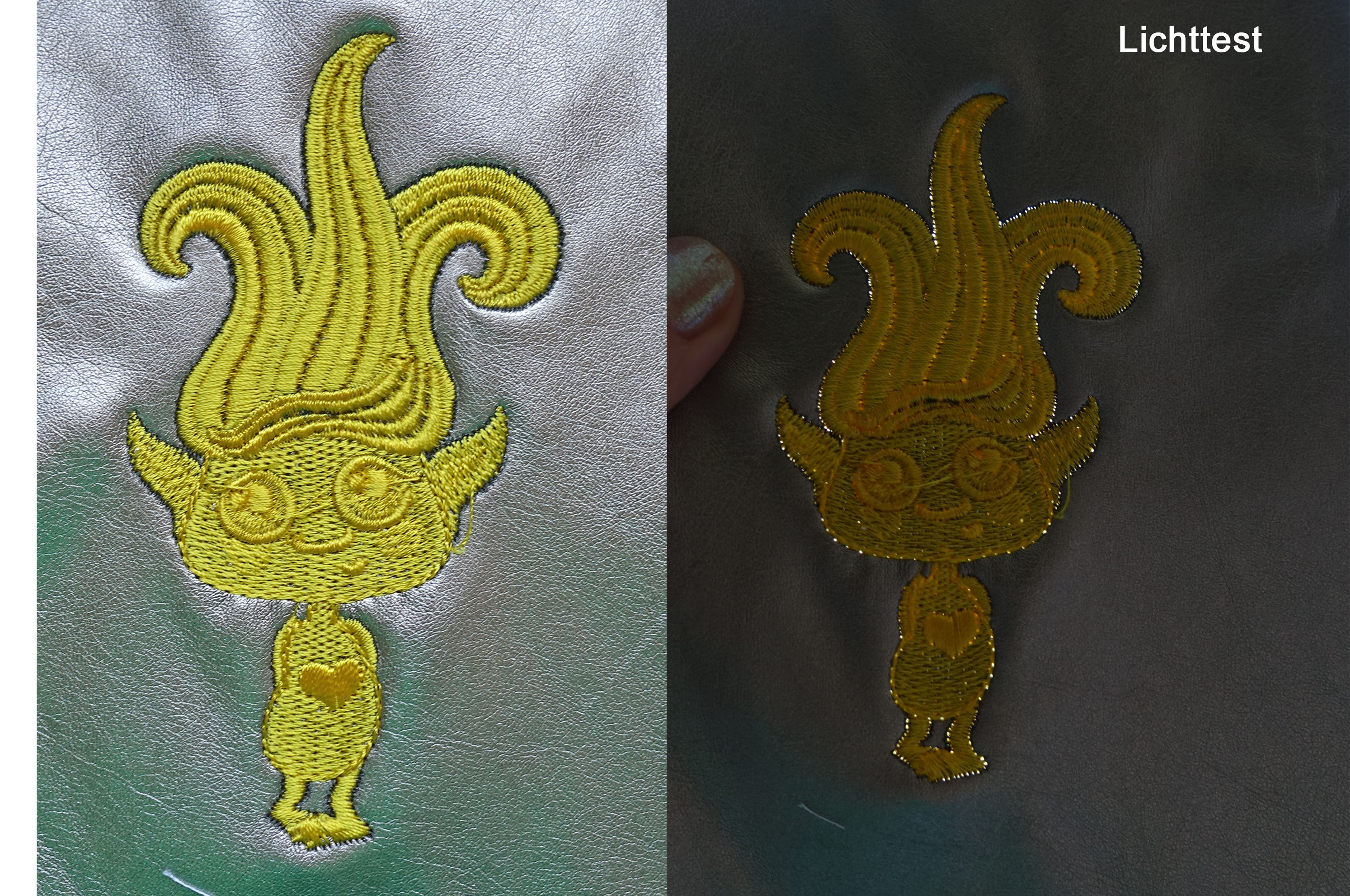 Hierbei habe ich ein sehr dünnes und dehnbares Kunstleder, dass ich nicht extra stabilisiert habe und mit Klebevlies abgestickt habe. Das Material hat Falten und Beulen, die Ränder sind sehr stark perforiert, jedoch nicht ausgestanzt. Im Lichttest sieht man die Perforierung sehr deutlich.