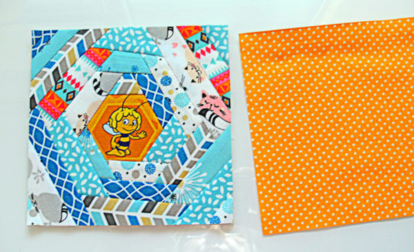 • Schablone herunterladen und ausdrucken. Sechseck auf die glatte Seite des Vliesofix übertragen und die Form auf die linke Seite des Motivstoffes aufbügeln. Genau ausschneiden.