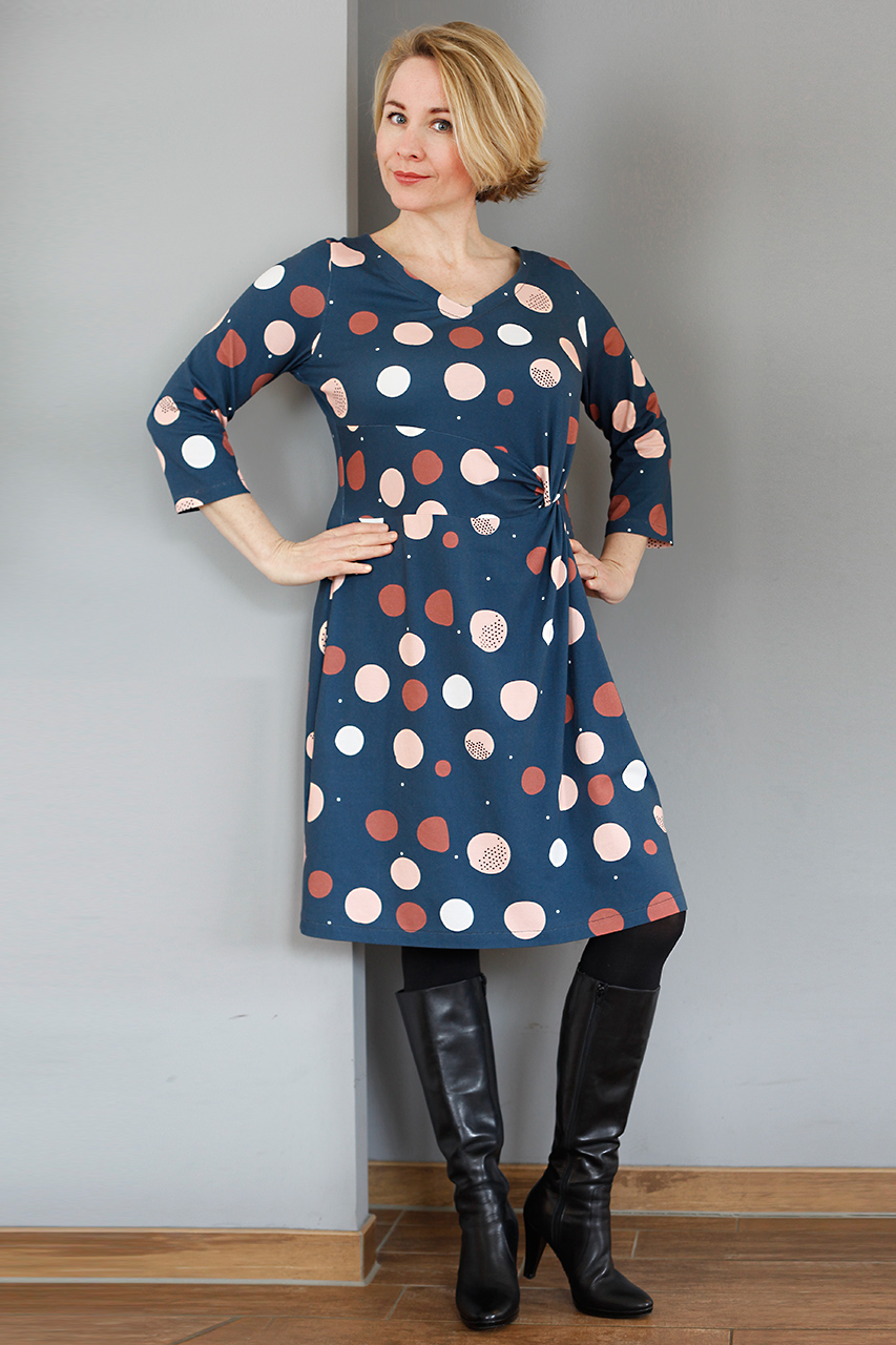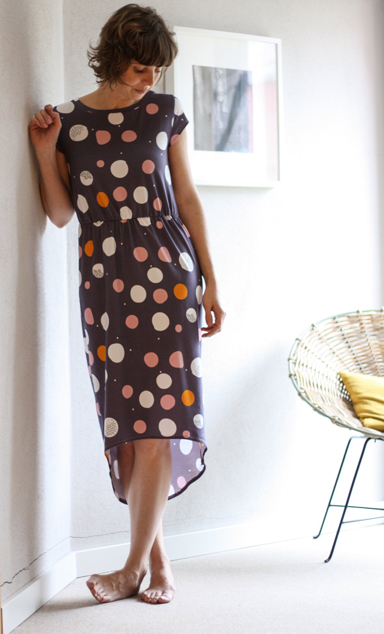 Erstmals erscheint eine Eigenproduktion in einer neuen Stoffqualität. Es ist ein Modal-Baumwoll-Jersey, der alle Vorteile beider Materialien in einem verbindet. Perfekt für Sommerkleider, leichte Jacken und für alles Damenhafte. Änni wird es vorerst in zwei Farbstellungen geben: petrolblau und fliedergrau!