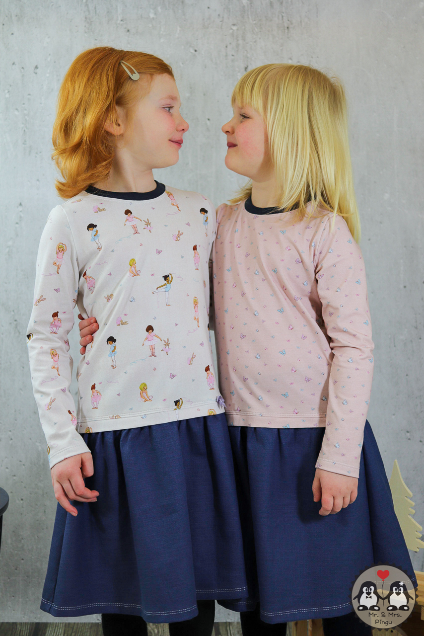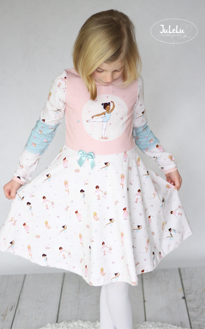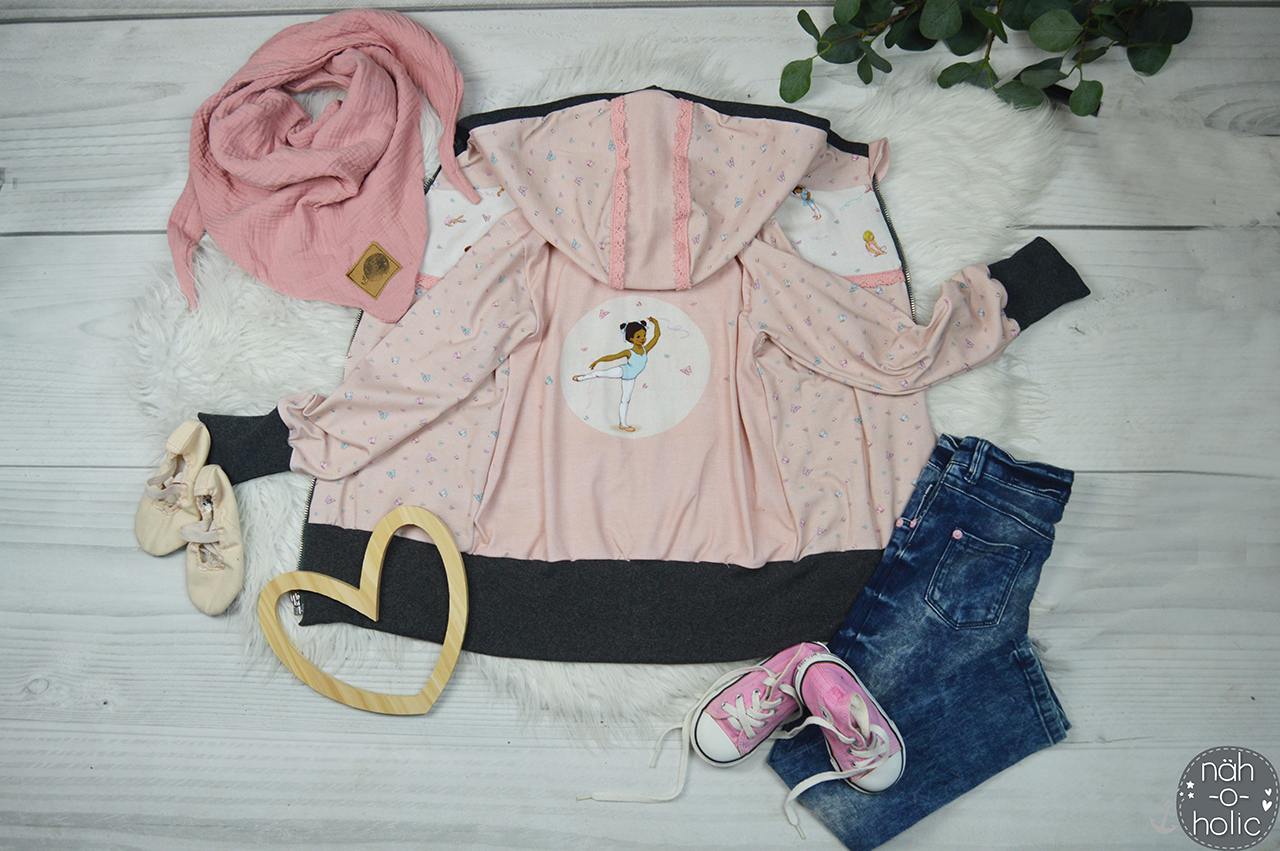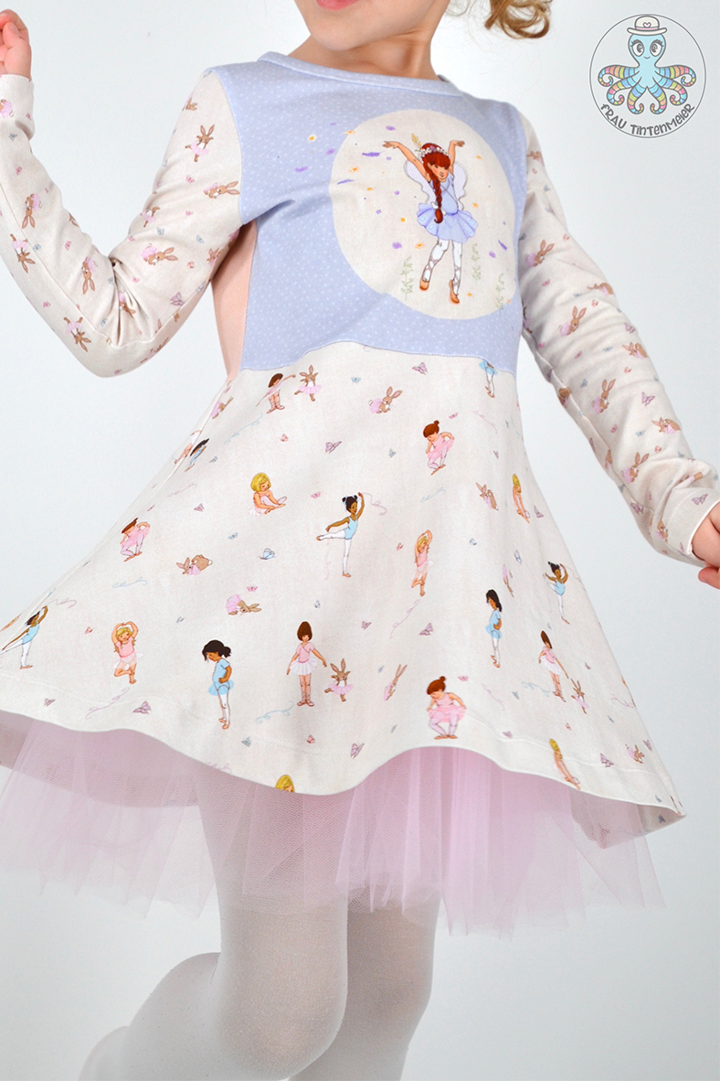 Sollen wir Euch in Geheimnis verraten? Der Hauptstoff ist unser persönlicher Favorit in dieser Kollektion. Wie geht es Euch damit? Die Ballerinas sind über den ganzen Stoff verteilt, ebenso wie die Schmetterlinge. Das lockert den Stoff ungemein auf, aber lässt ihn auch gleichzeitig zart und zurückhaltend erscheinen.