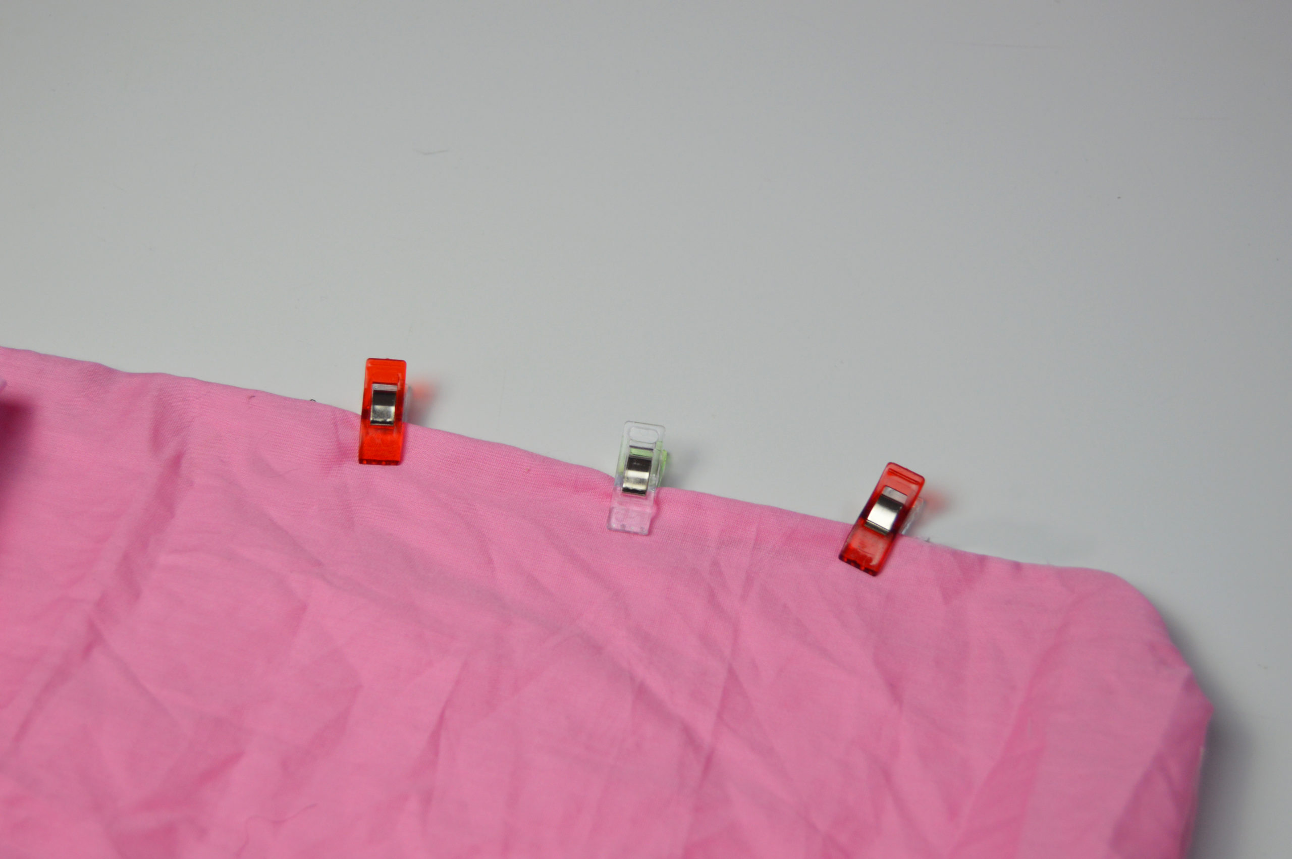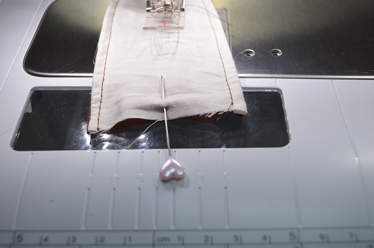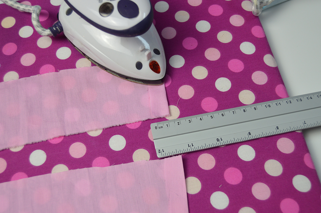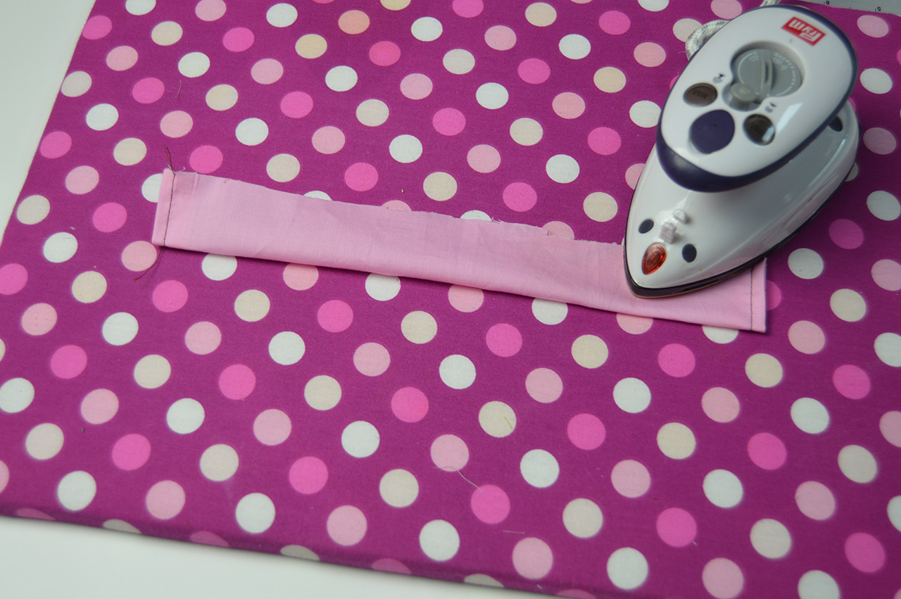Nun bereiten wir die Tunnelzüge vor. Dazu seitlich jeweils links auf links 1 cm nach innen klappen, bügeln und im Anschluss absteppen. Der Tunnel wird nun in der Höhe auf die Hälfte links auf links gefaltet und ebenfalls gebügelt.