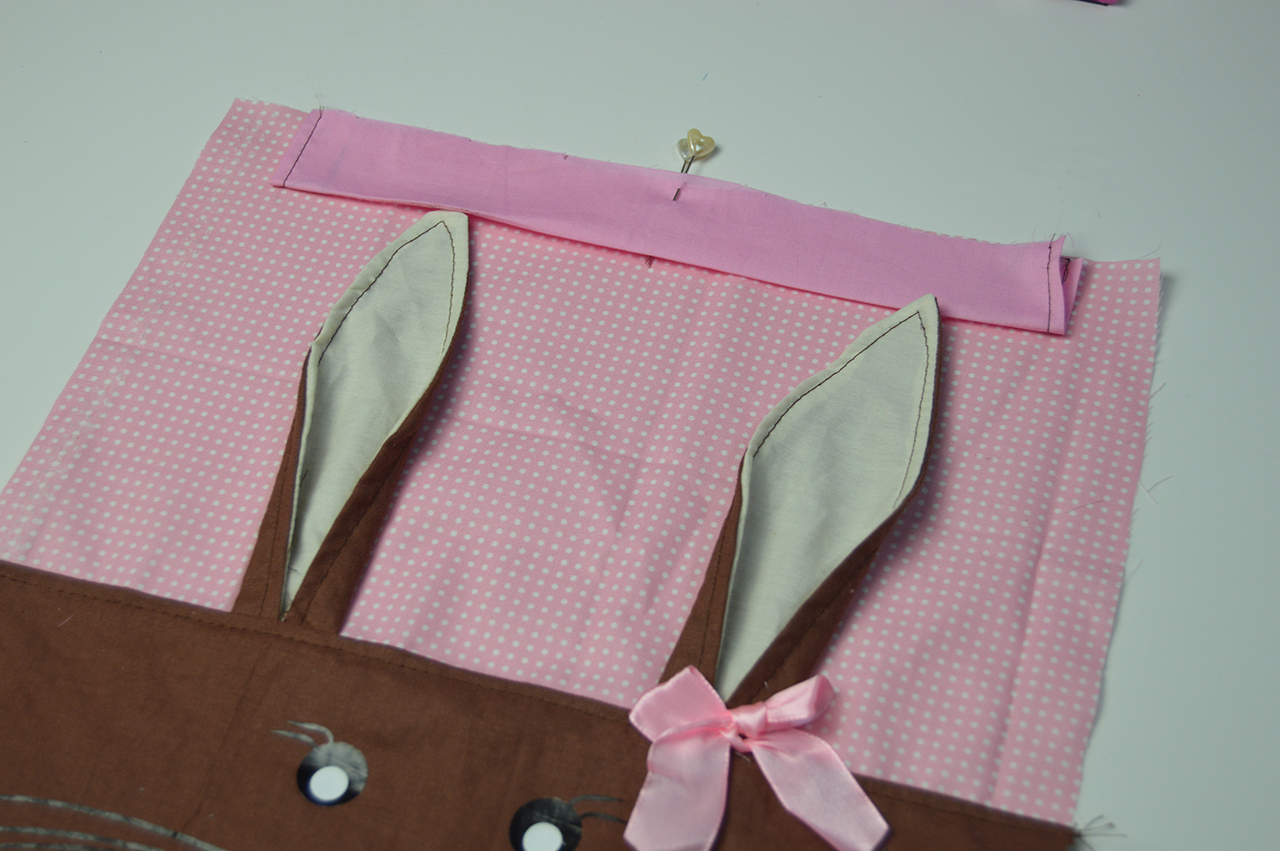 Das obere Vorderteil legst Du jetzt auf das untere Teil mit den Ohren und nähst die gelb markierte Strecke. Das obere Teilun wieder hochklappen, die Naht gut bügeln und absteppen. Beachte : Die Nahtzugabe liegt in Richtig des Gesichtes.