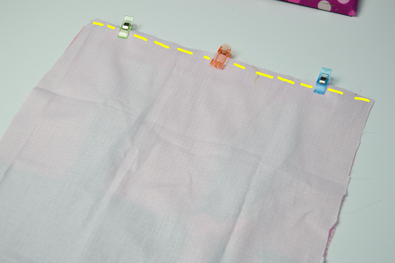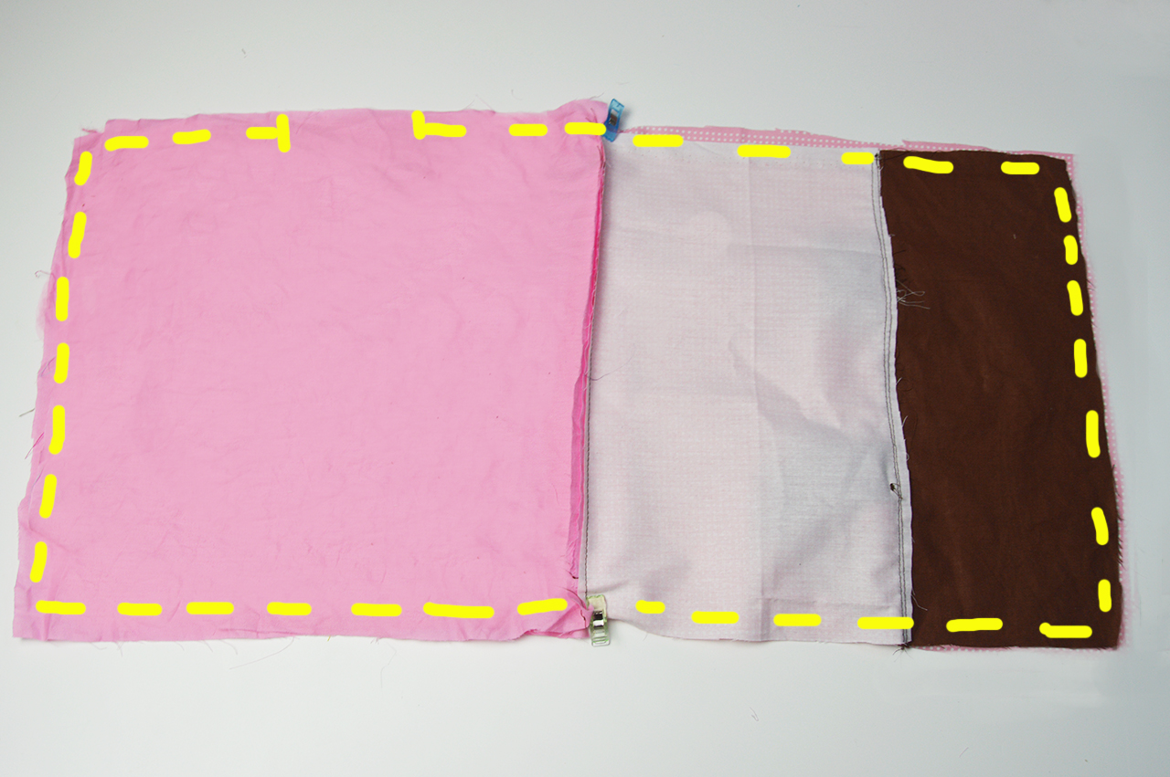 Als nächstes legt ihr die Stoffe so aufeinander, dass Außenteil auf Außenteil trifft und Innenfutter auf Innenfutter. Achtet darauf, dass in der Mitte die Nähte genau aufeinander treffen und ihr keinen Versatz habt. Steckt oder klammert Euch die Seiten gut fest, damit nichts verrutscht. Nun näht ihr die im Foto gelb markierte Strecke. Vergesst nicht, am Anfang und Ende gut zu verriegeln. An einer Seite lasst ihr im Innenfutter eine Wendeöffnung von ca. 6-7 cm, bei dickerem Material wie z B. Kunstleder lasst ihr eine ca. 10 cm große Wendeöffnung.