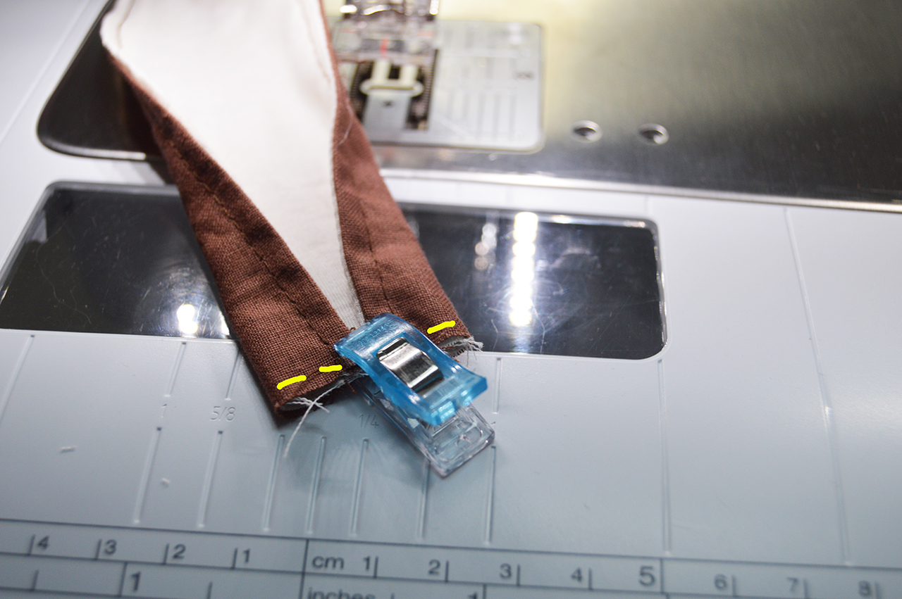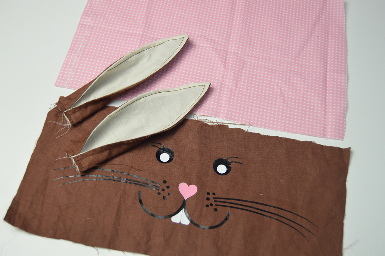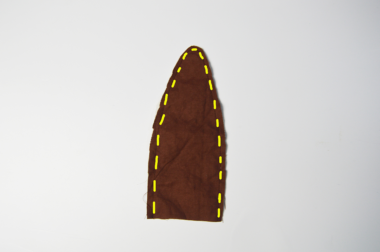 Die Ohren werden  rechts auf rechts zusammen gesteckt und entlang der gelben Markierung zusammen genäht. Der untere Bereich bleibt dabei offen. Schneide die NZ knapp zurück, wende die Ohren und forme sie aus. Um die Ohren besser absteppen zu können, bügel sie kurz. Im Anschluss werden die Ohren knappkantig abgesteppt.