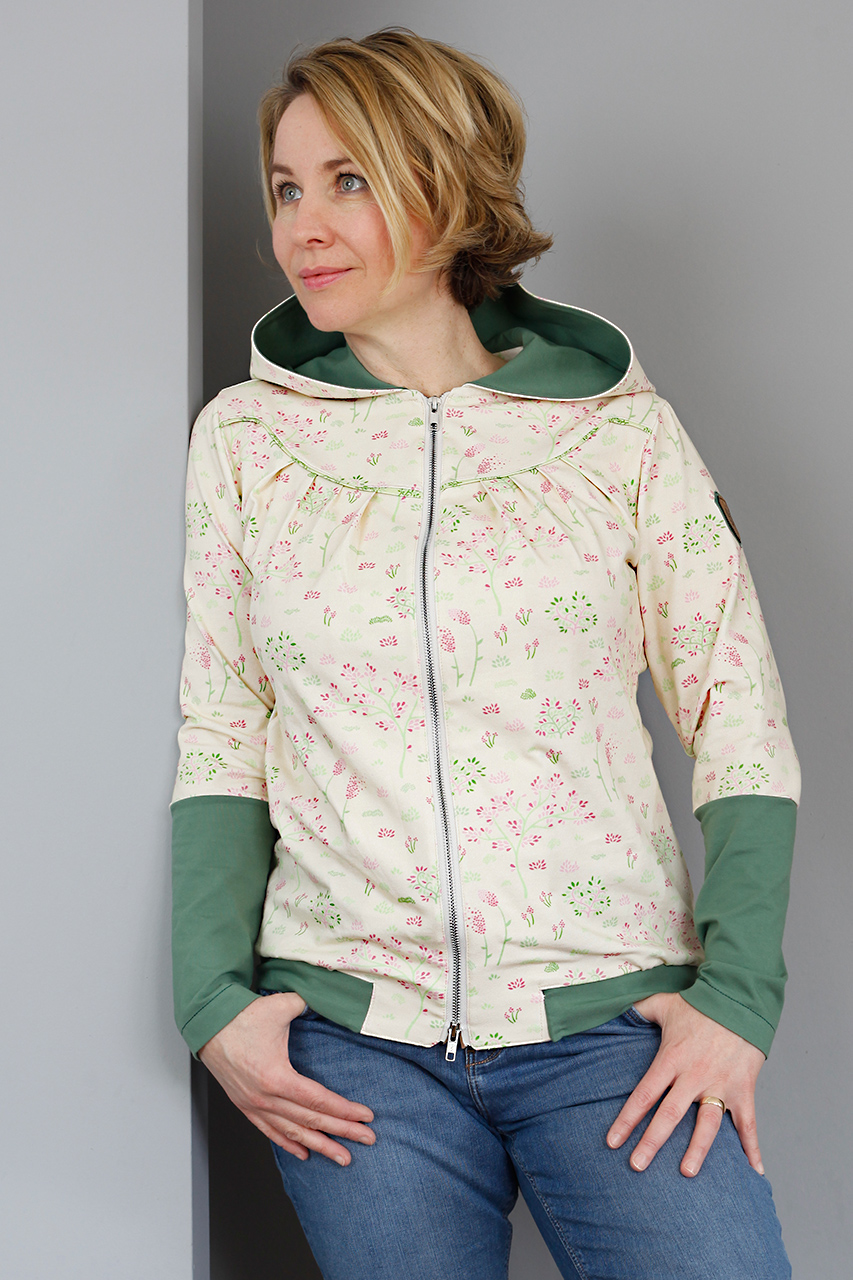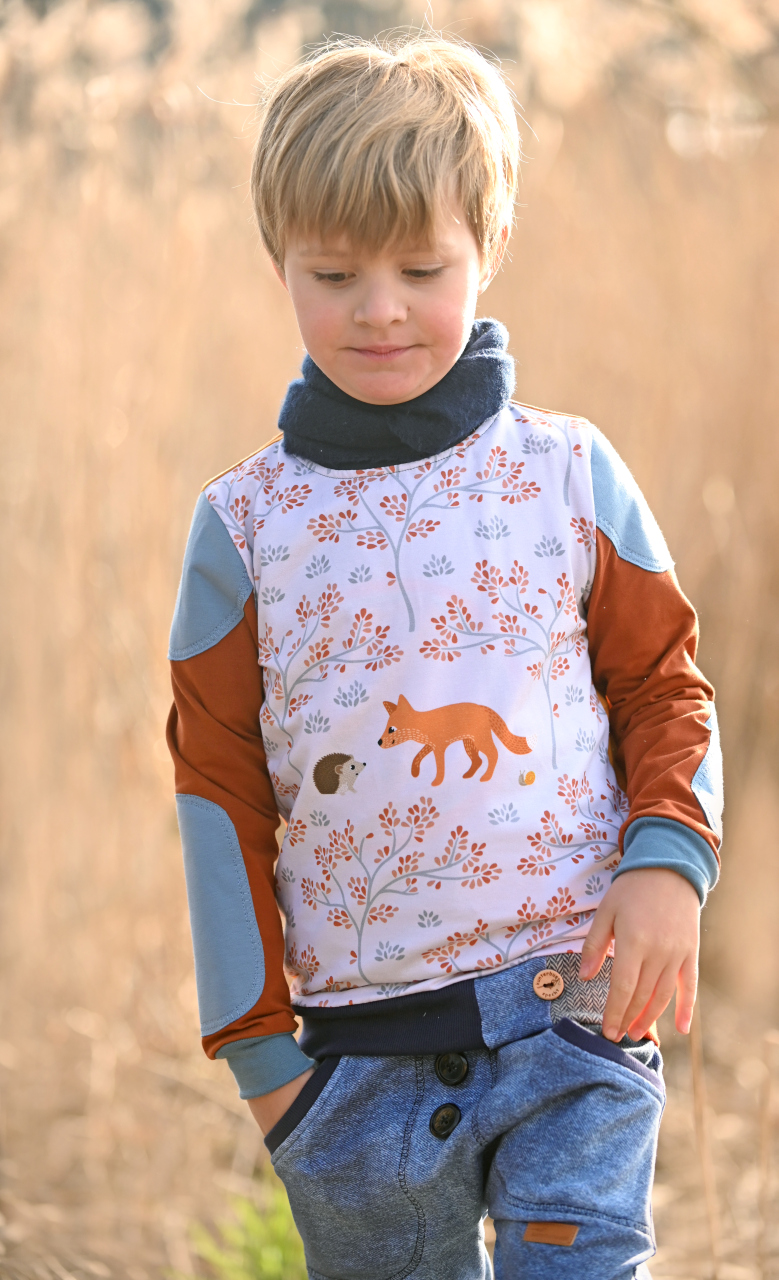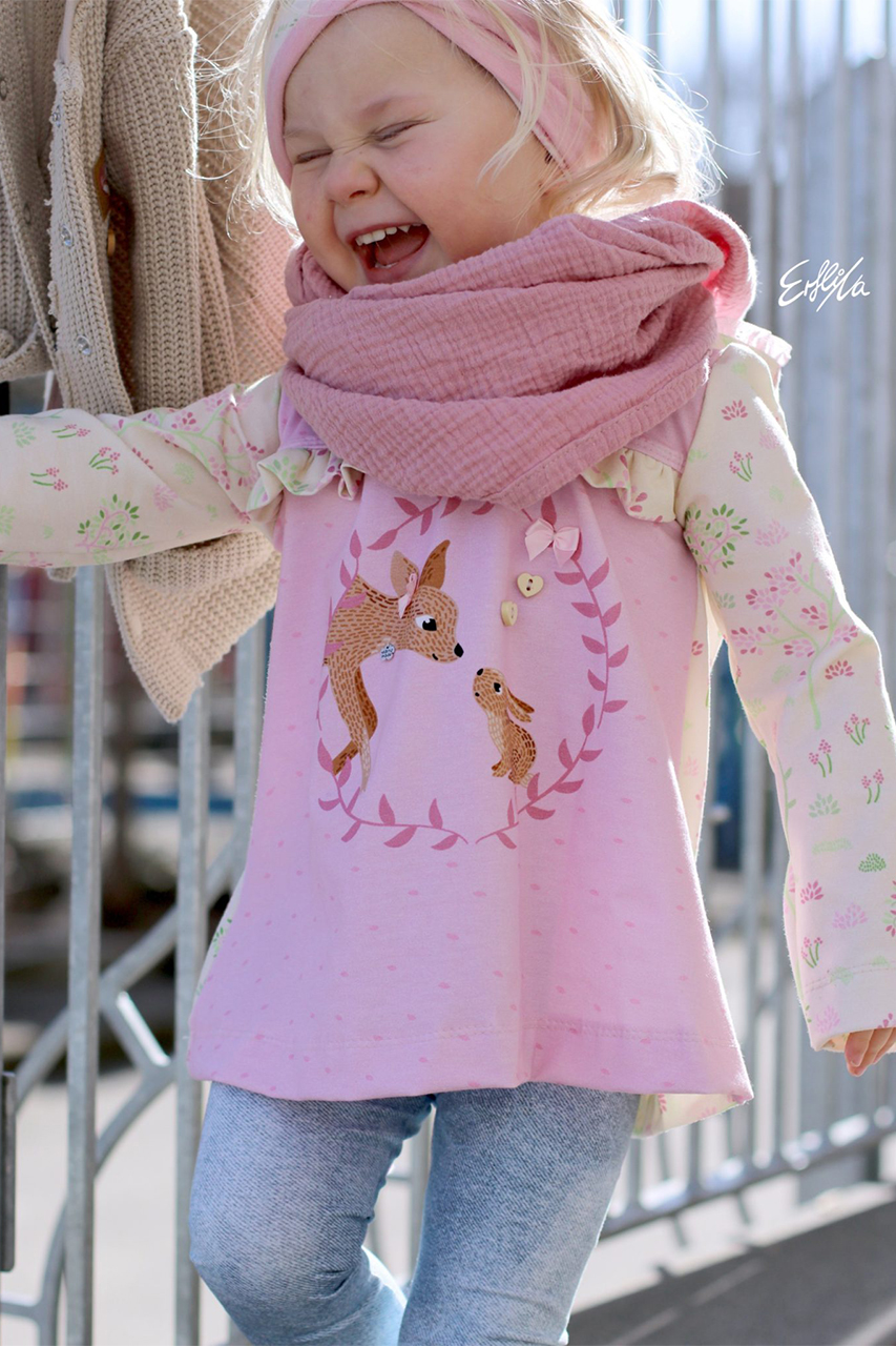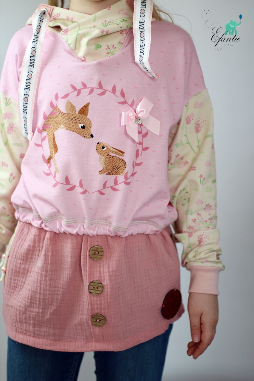 Wie ihr weiter unten, bei den Designbeispielen, sehen könnt, sind der Hauptstoff „La Foret“ und die Kombistoffe auch solo vernäht absolut schön. Nicht nur Kinder kommen mit den neuen Stoffen auf ihre Kosten, unsere Designnäherinnen haben auch traumhafte Damenbeispiele für Euch genäht.