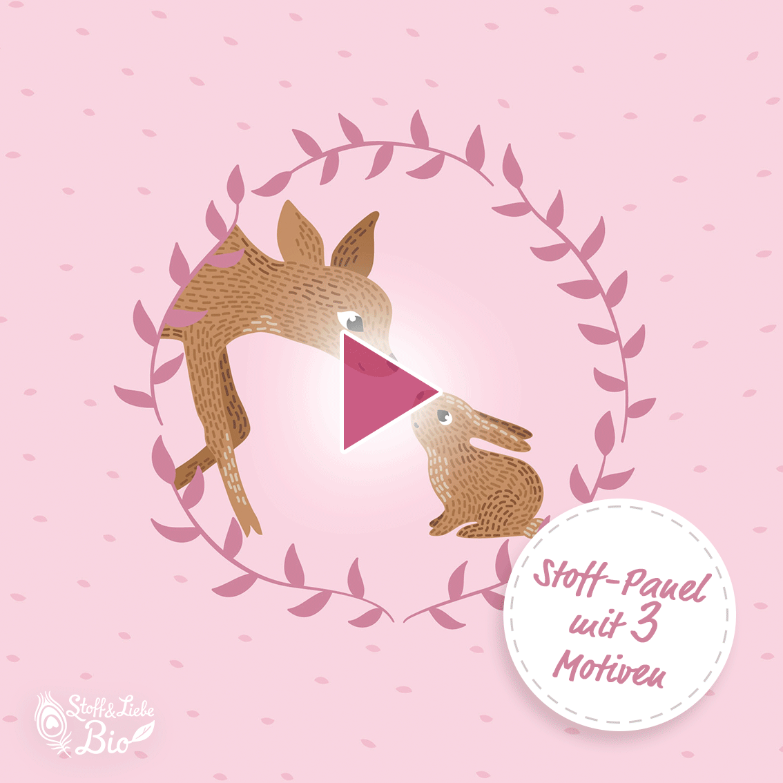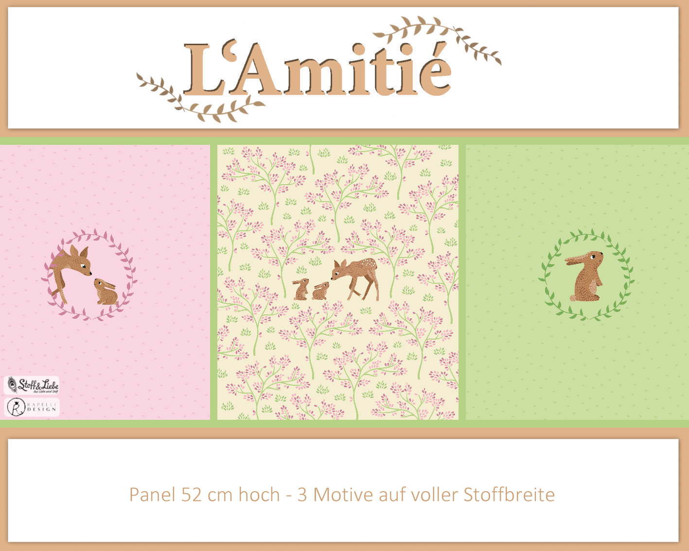Der Hauptstoff „Bambi – La Foret“ ist ein Allover Druck in rosa und grün auf Vanille farbenem Untergrund. Er passt genauso hervorragend zu dem Panel „Hase & Reh“, wie der unten angebildete Kombistoff „Bambi Caramel“.