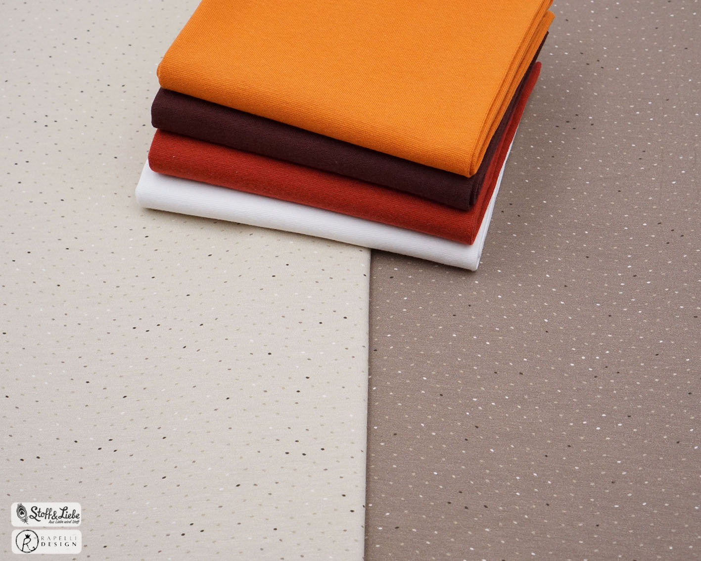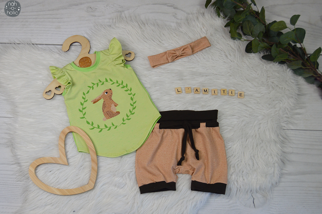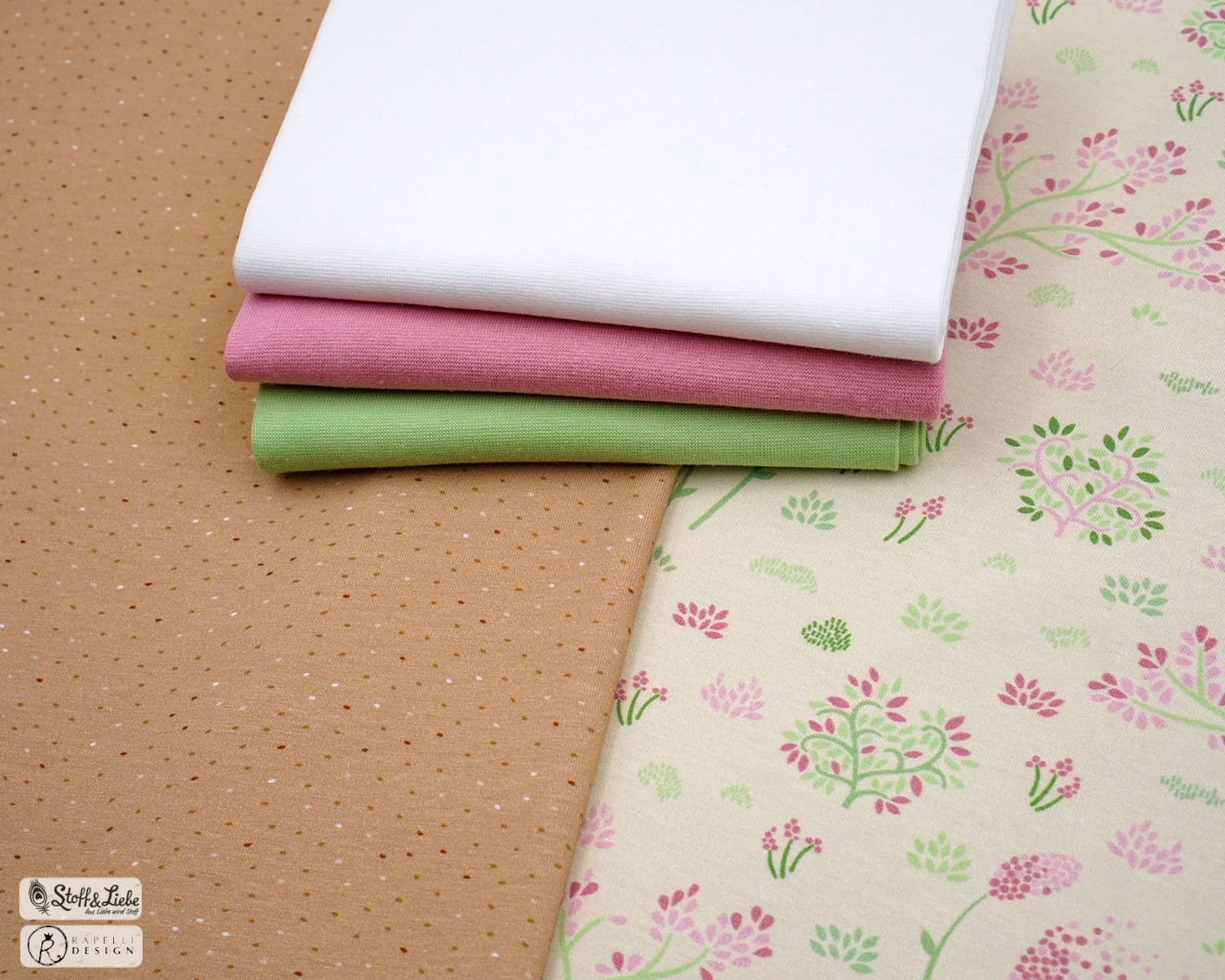 Als Kombistoffe haben wir diese drei für Euch: Igel Chocolate, Igel Straciatella für das blau-braune Panel „Fuchs & Igel“ und der oben erwähnte Bambi Caramel, der zu dem rosa-grünen „Bambi & Hase“ passt.