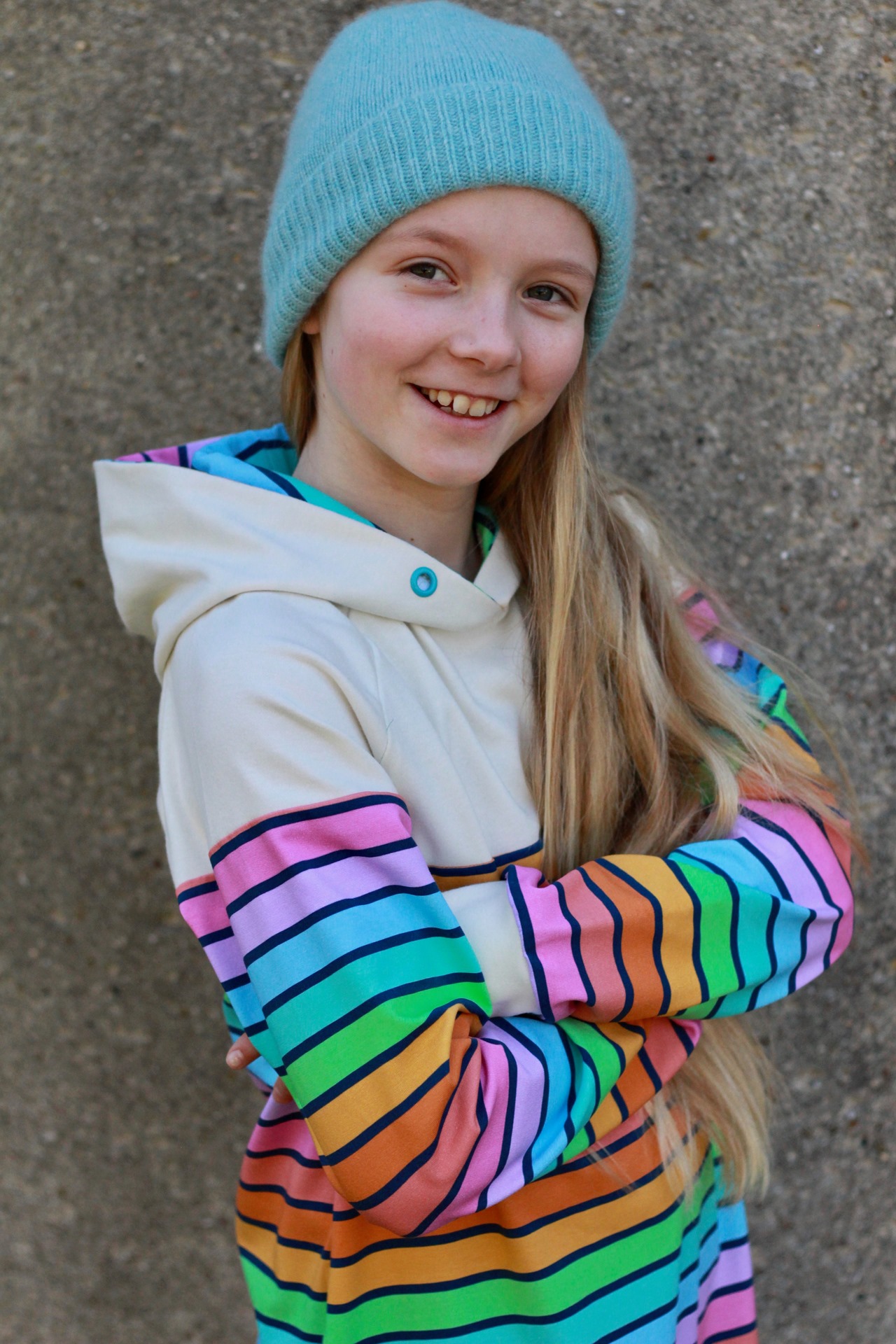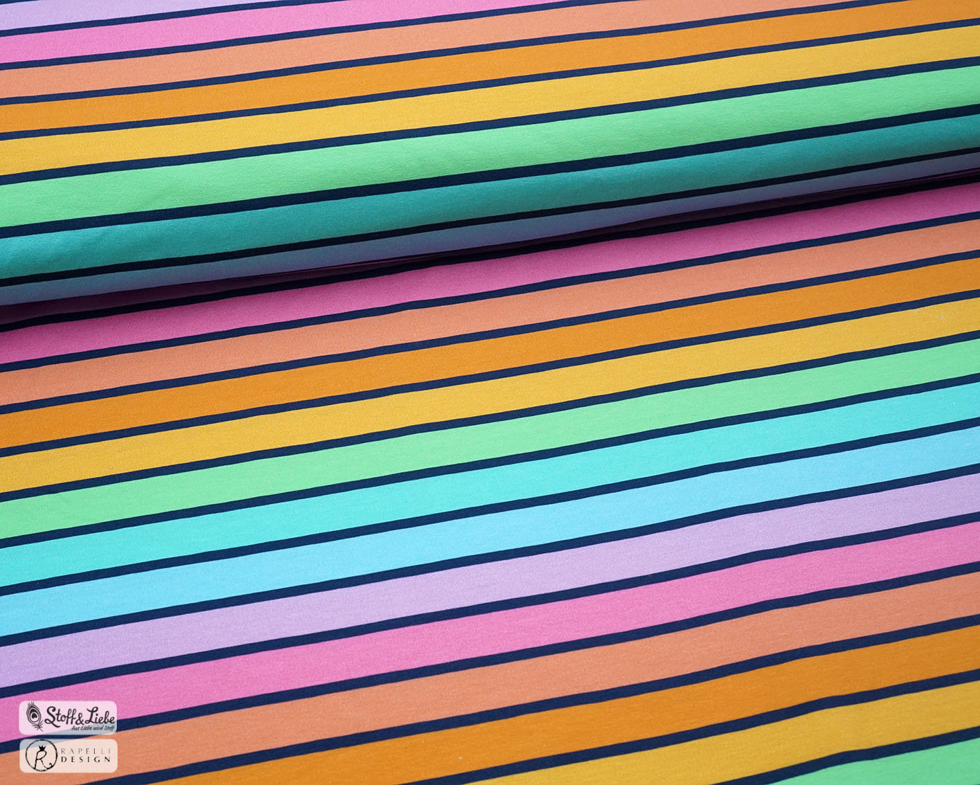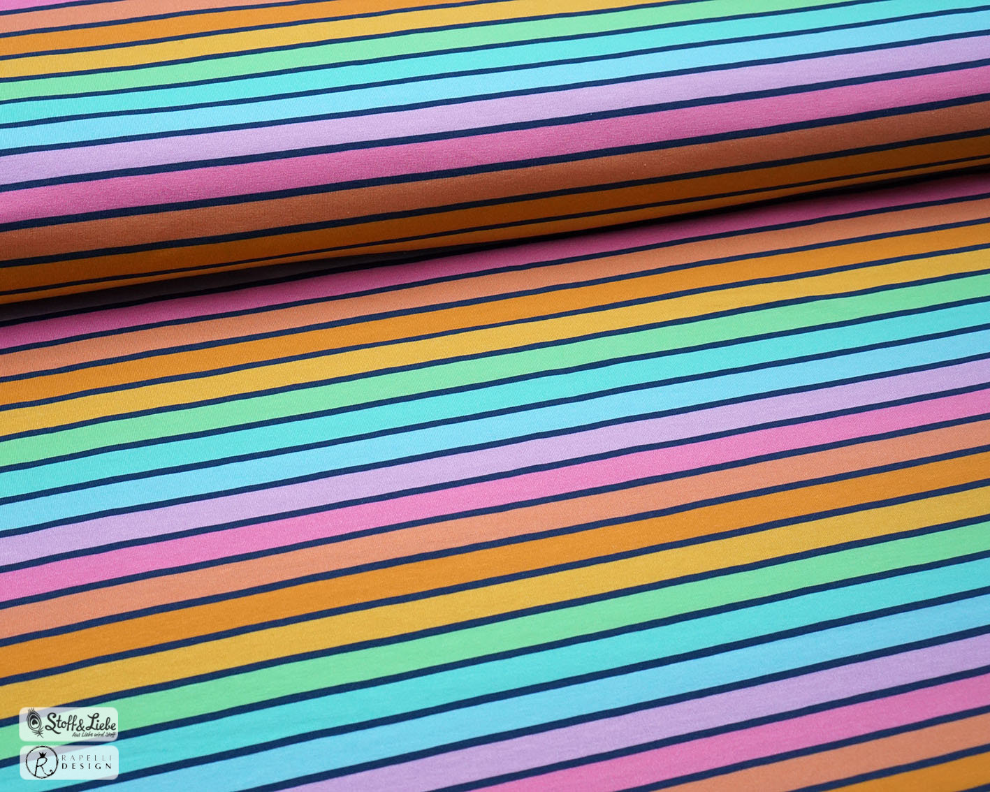Die Kollektion besteht aus drei farbenprächtigen Stoffen in gewohnter Bio Qualität. Es erwartet Euch ein detailreicher Hauptstoff mit einer Materialzusammensetzung von 95%Baumwolle und 5% Elasthan, sowie die Rainbow Stripes in Small und Large.
