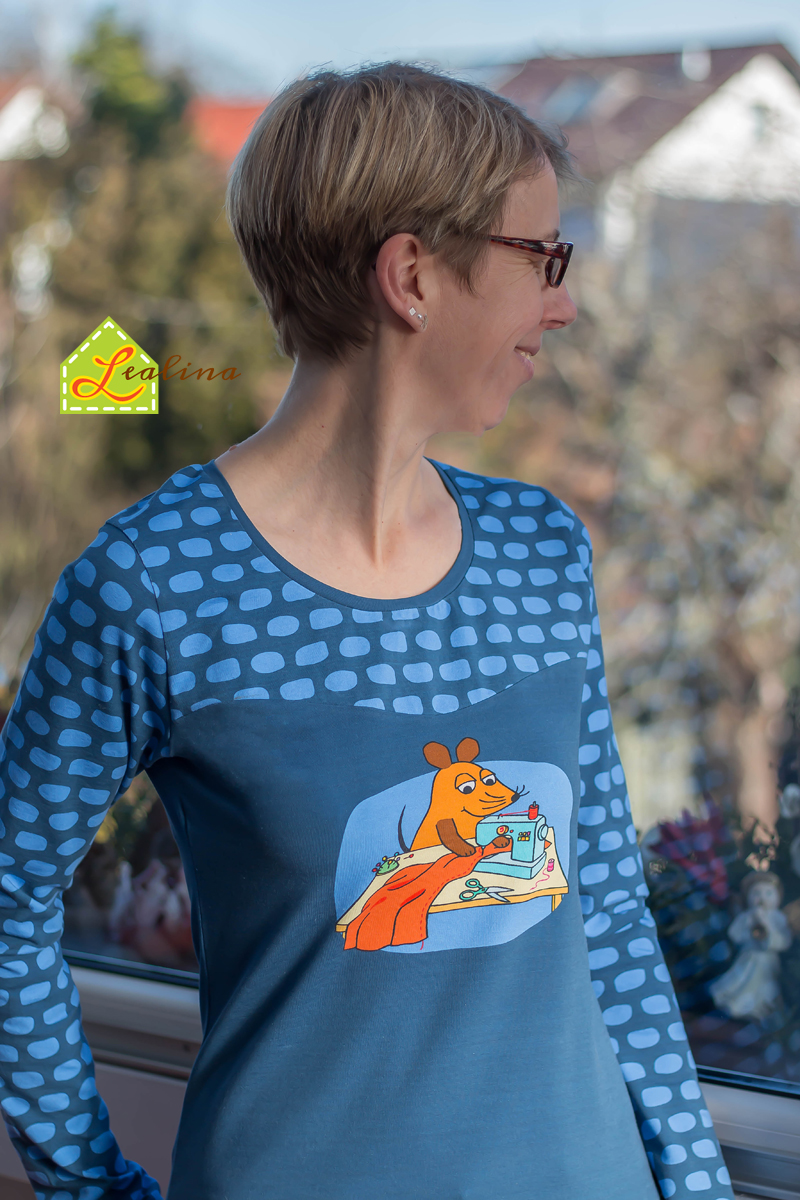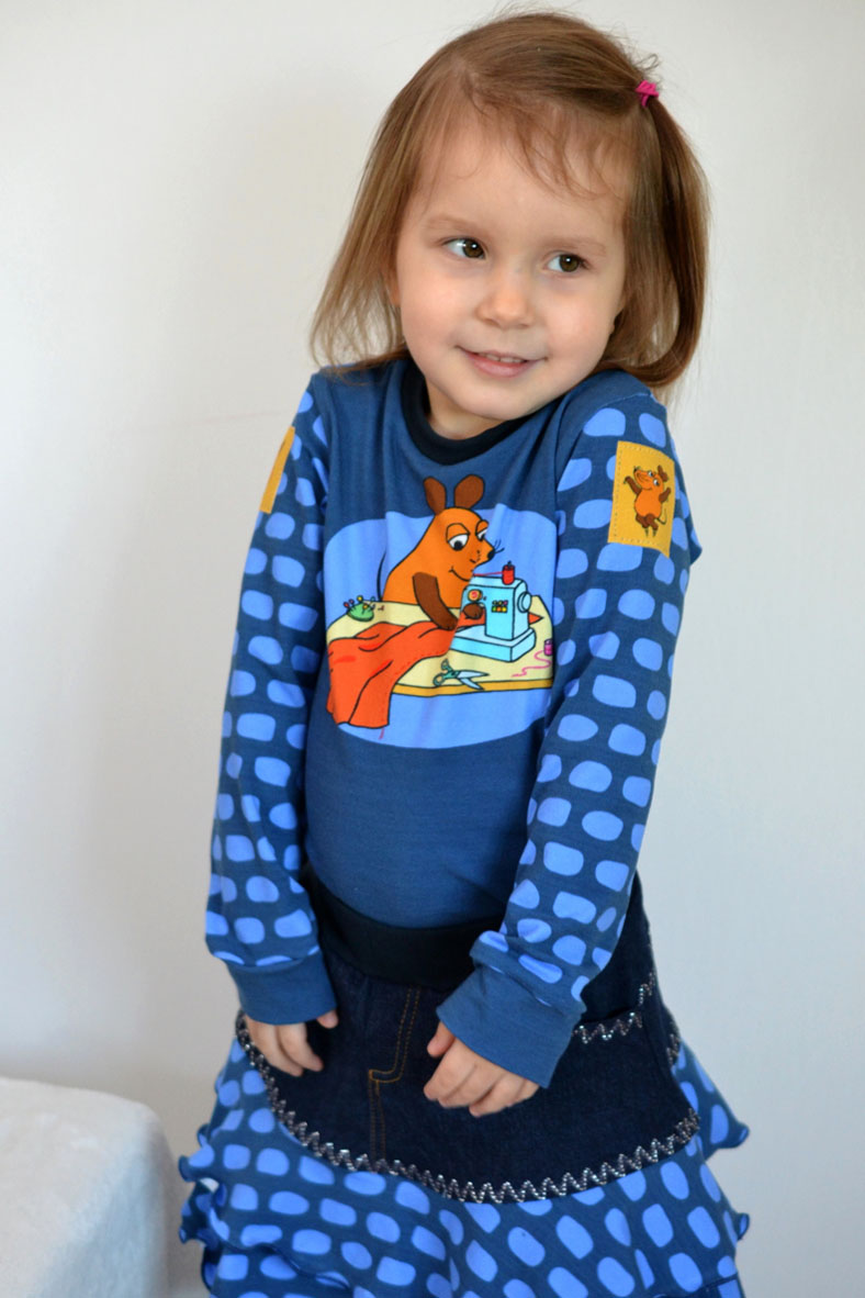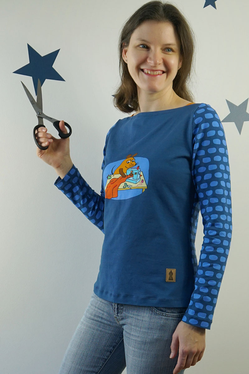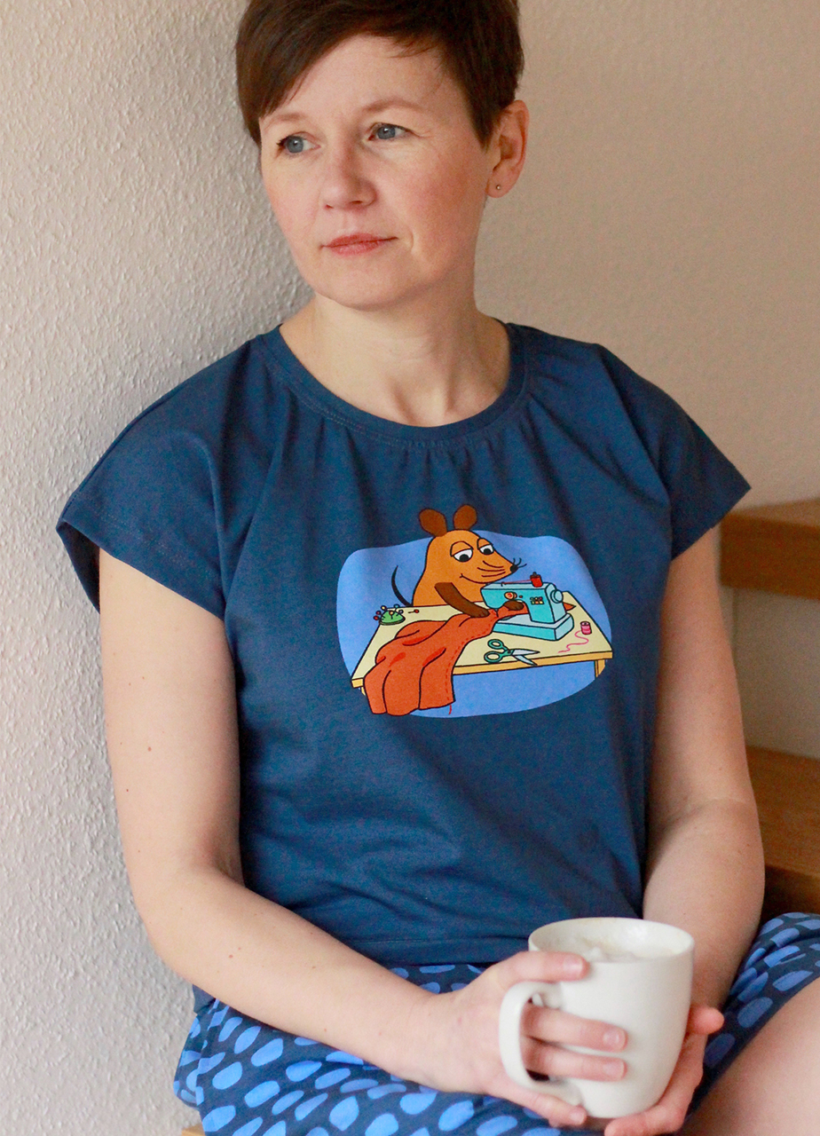 Die Nähmaus erscheint auf Bio Jersey mit einer Materialzusammensetzung von 95% Bio Baumwolle und 5% Elasthan.