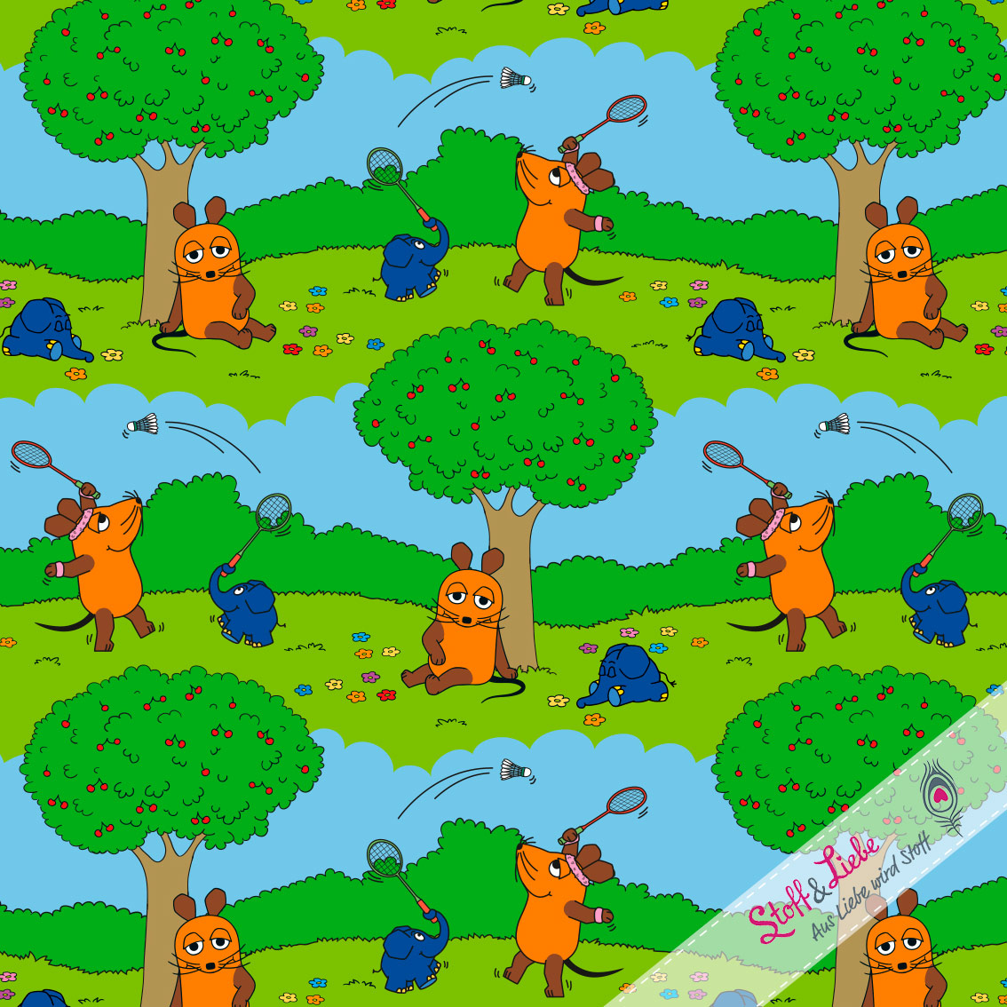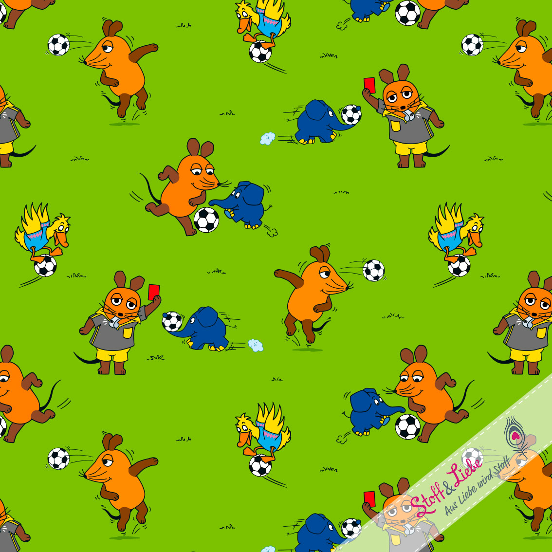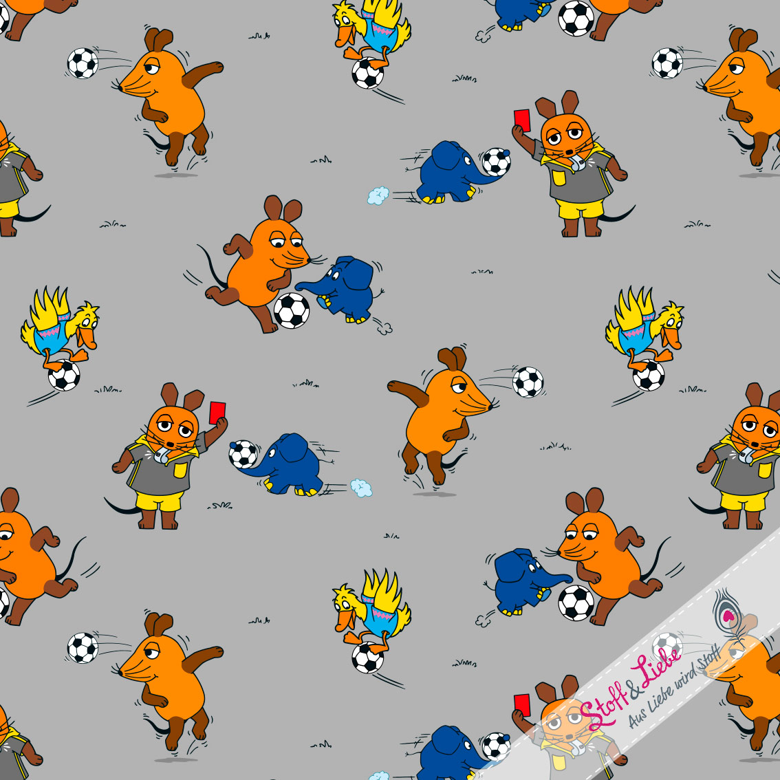 Drei Hauptstoffe im Allover Design warten auf Euch. Die Maus und der Elefant beim Federballspielen in satten Farben, sowie die Maus, die Ente und der Elefant als Fußballstars. Hier bieten wir Euch die Stoffe auf grauem und grünem Hintergrund an. Perfekt für sommerliche Outfits wie Shirts, Hosen, aber auch Kleider oder Jacken sind ganz zauberhaft aus diesen Stoffen.