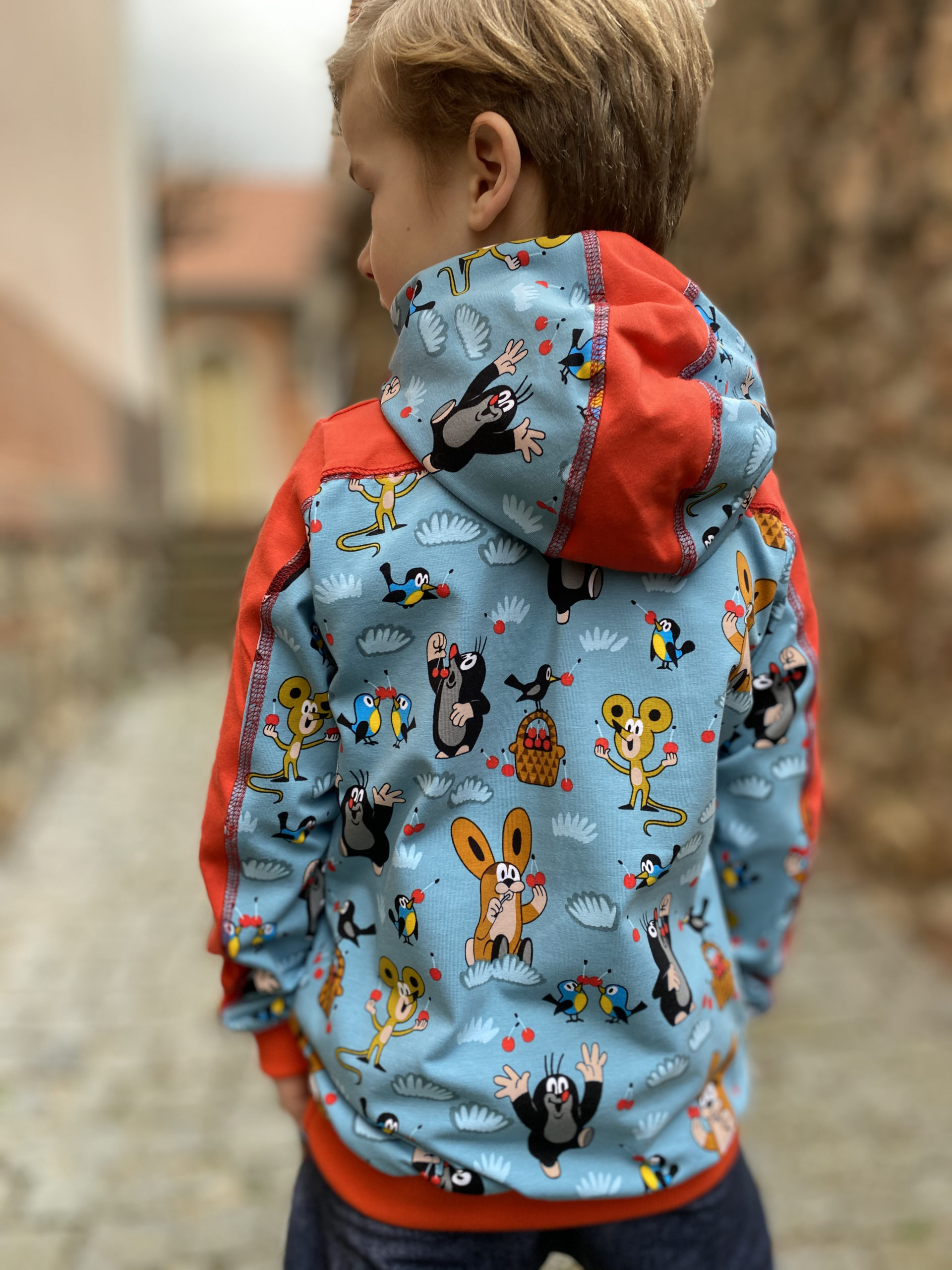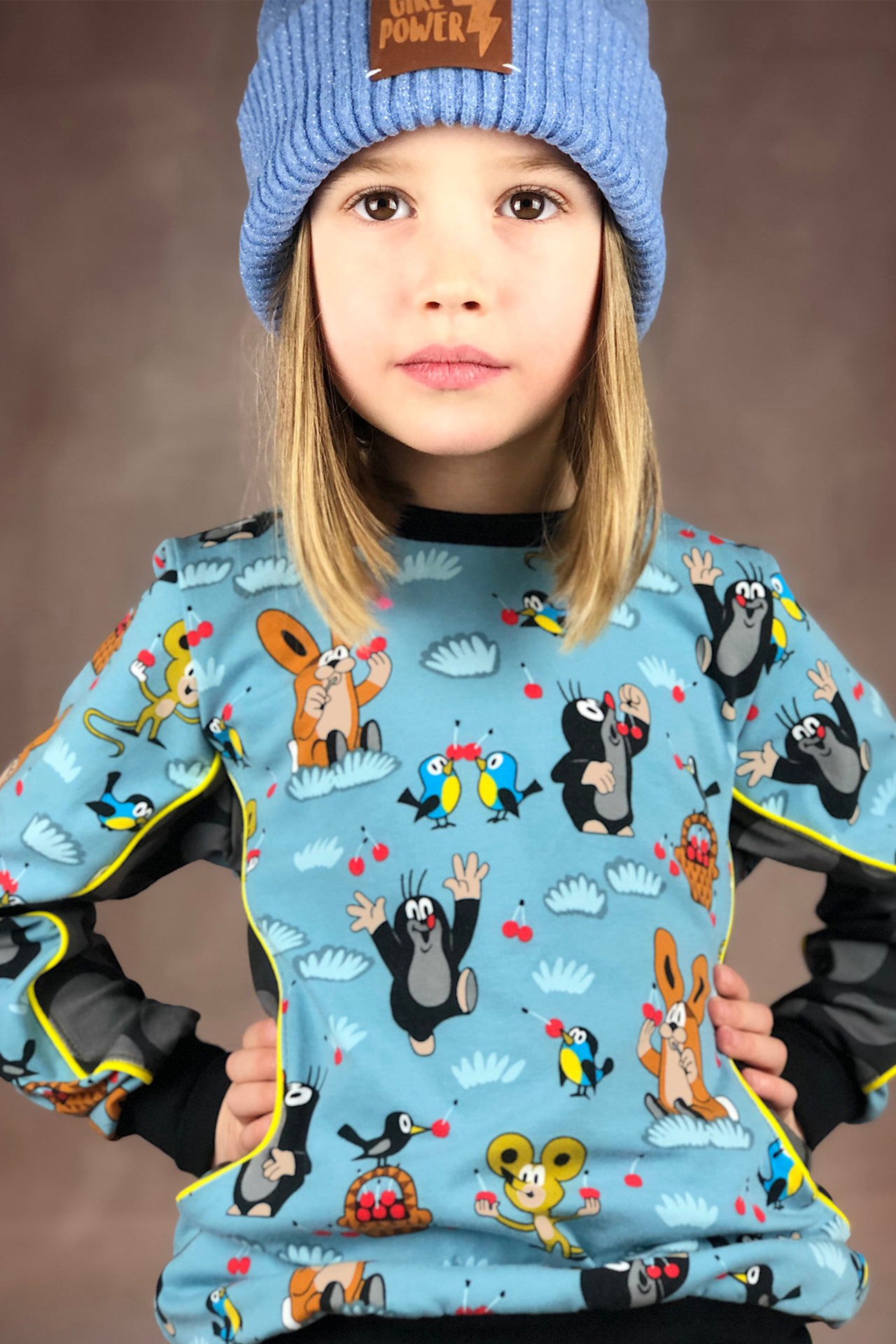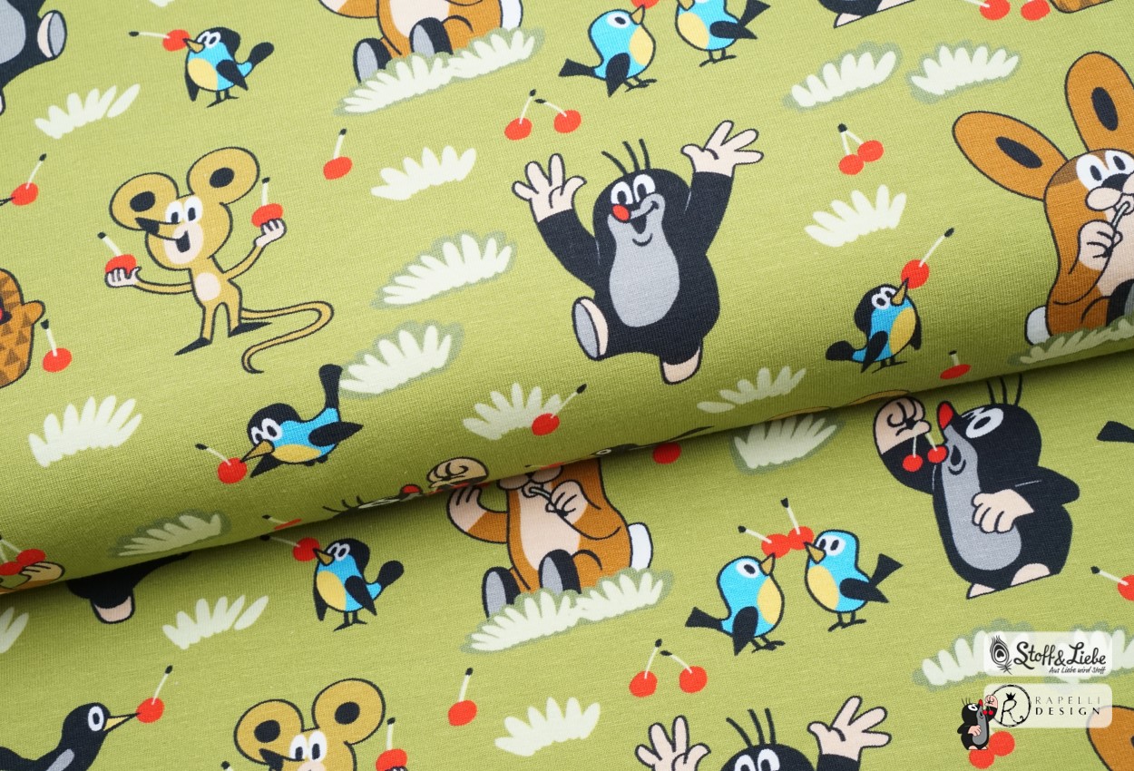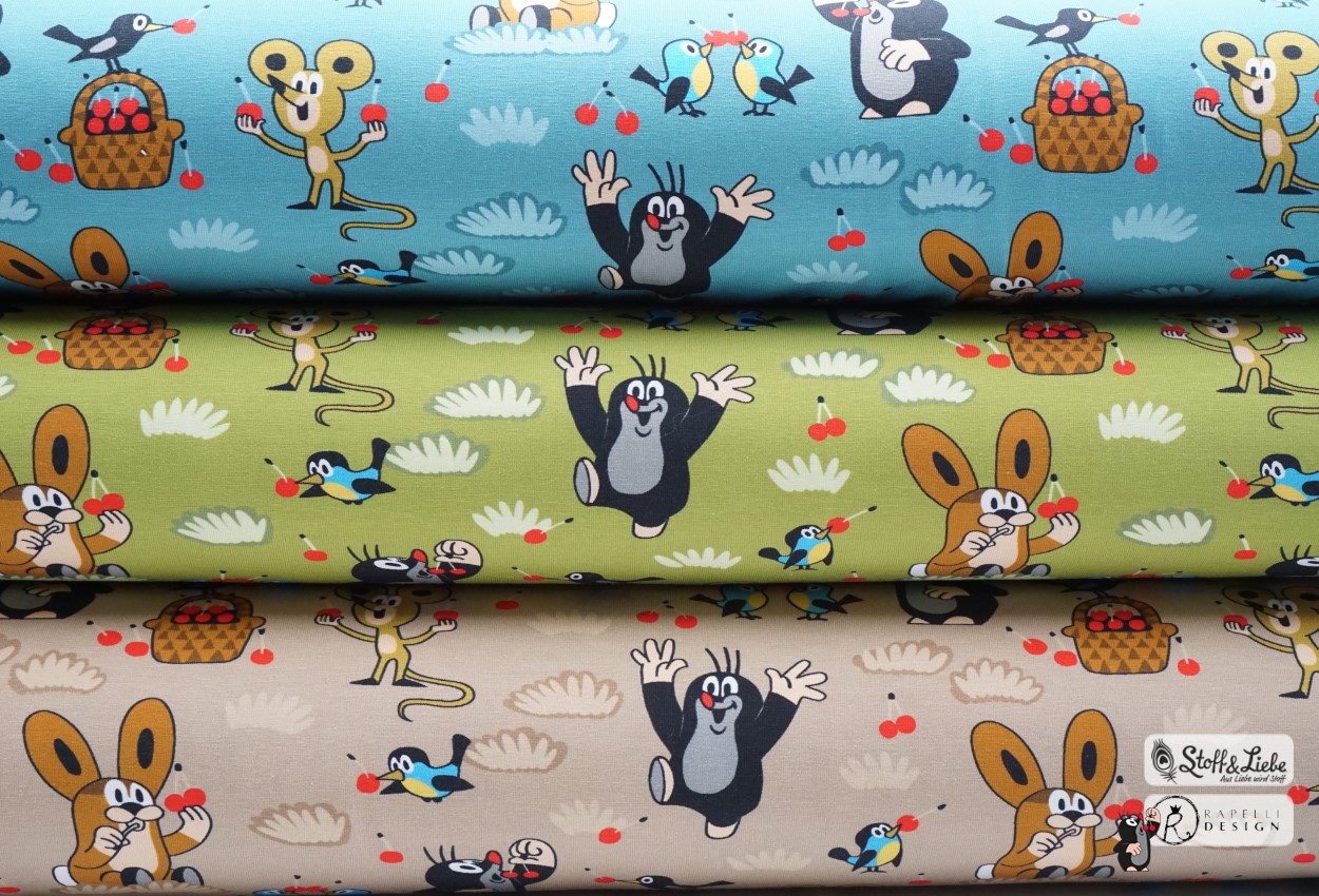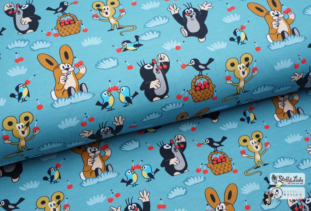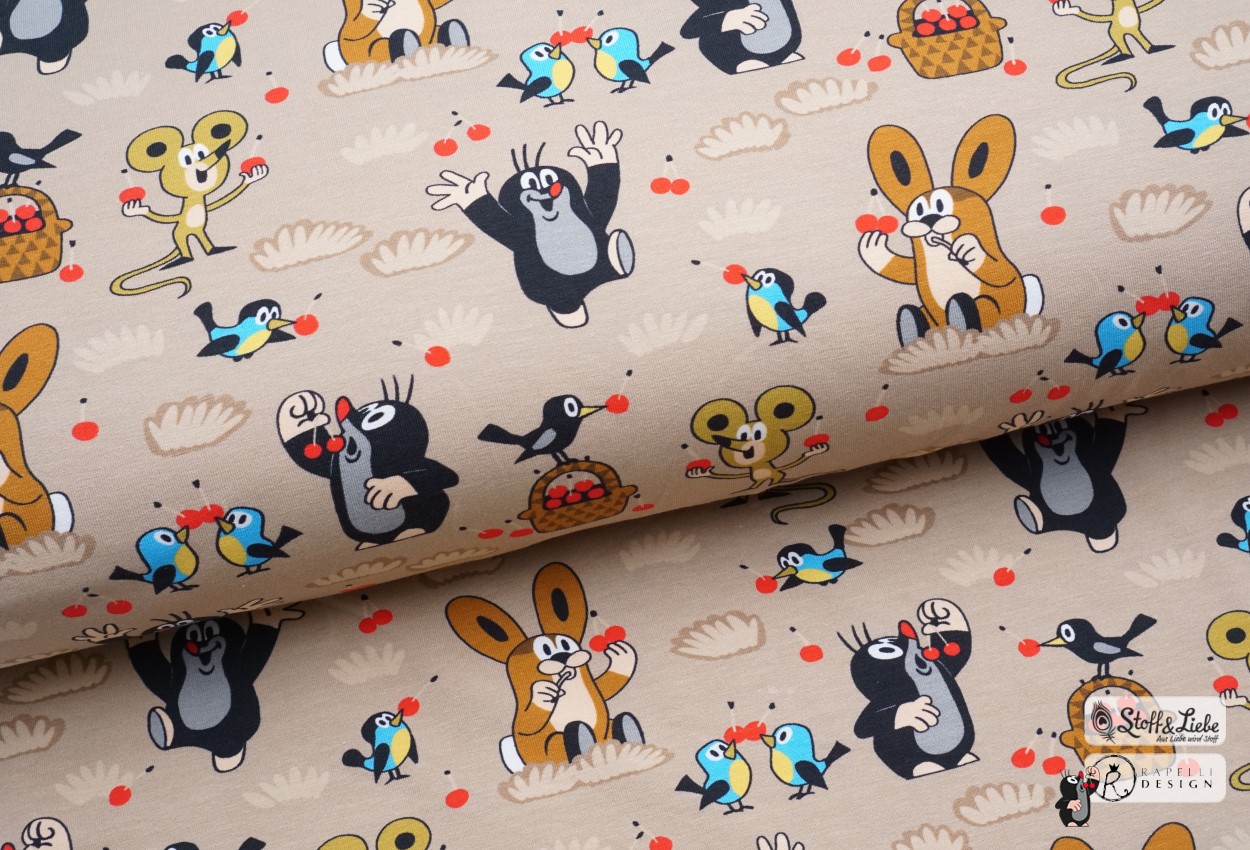 Der kleine Maulwurf Kirschenfest erscheint auf Jersey mit einer Materialzusammensetzung von 95% Baumwolle und 5 % Elasthan.