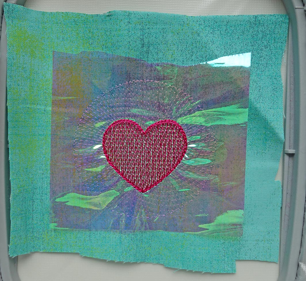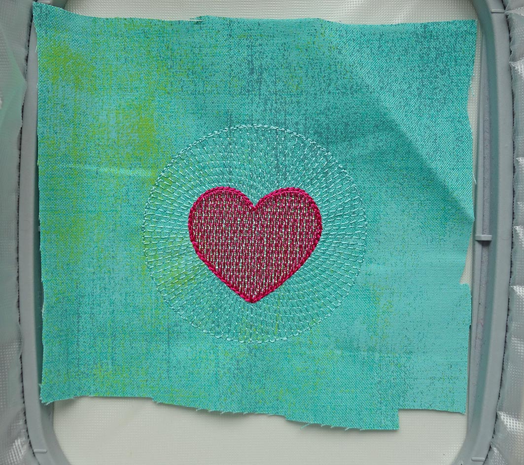 Lege Stickfolie auf und sticke das Herz. Anschließend kann die Folie abgerissen werden. Wenn Du ohne Folie stickst, sticke die Sequenz einfach ohne.