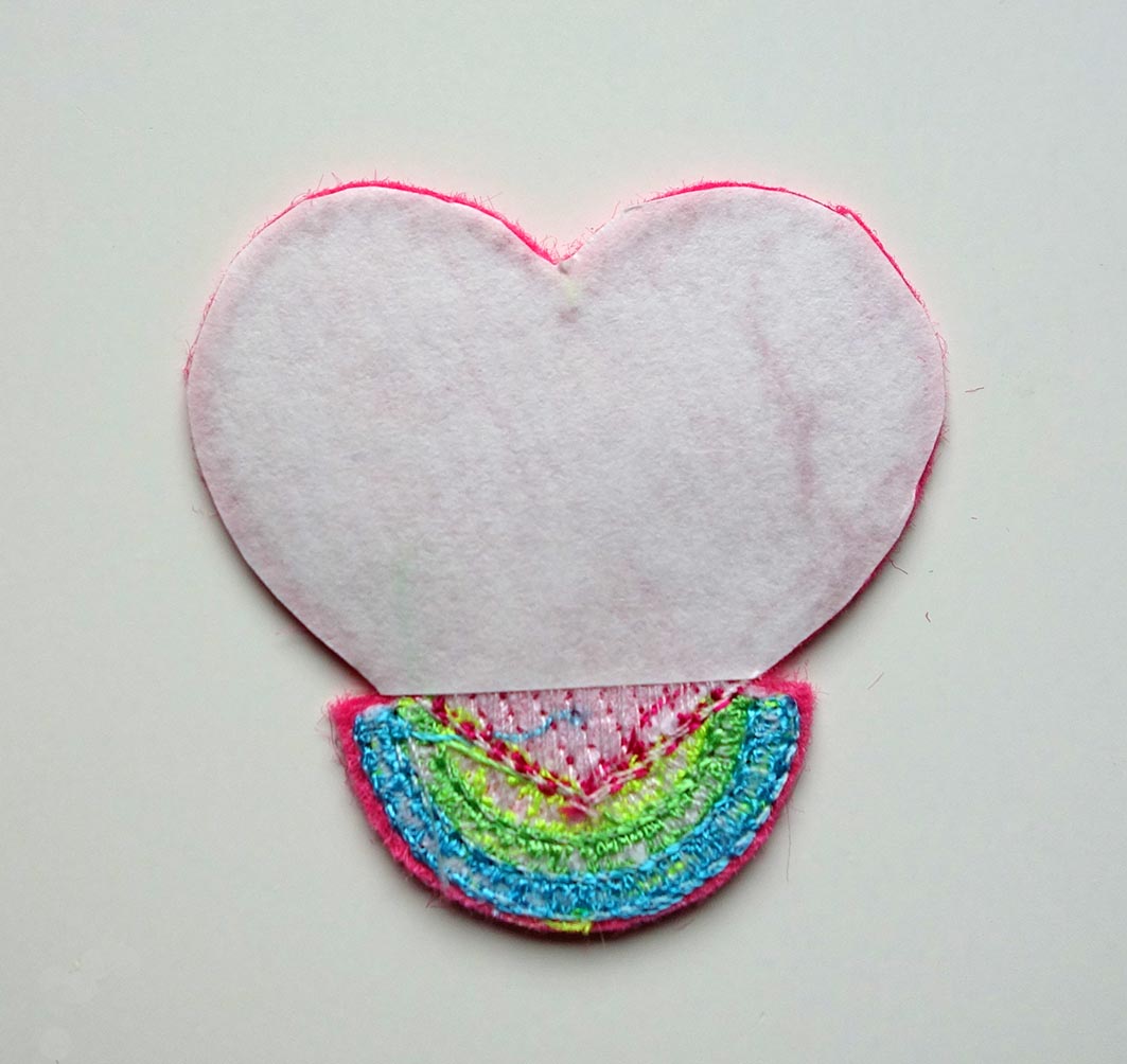 Schneide die überhängenden Teile weg, entferne die Papierrückseite und positioniere das zweite Herz links auf links aufeinander. Bügle die beiden Teile über einem Tuch oder Backpapier zusammen.