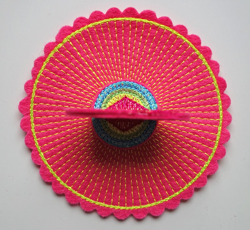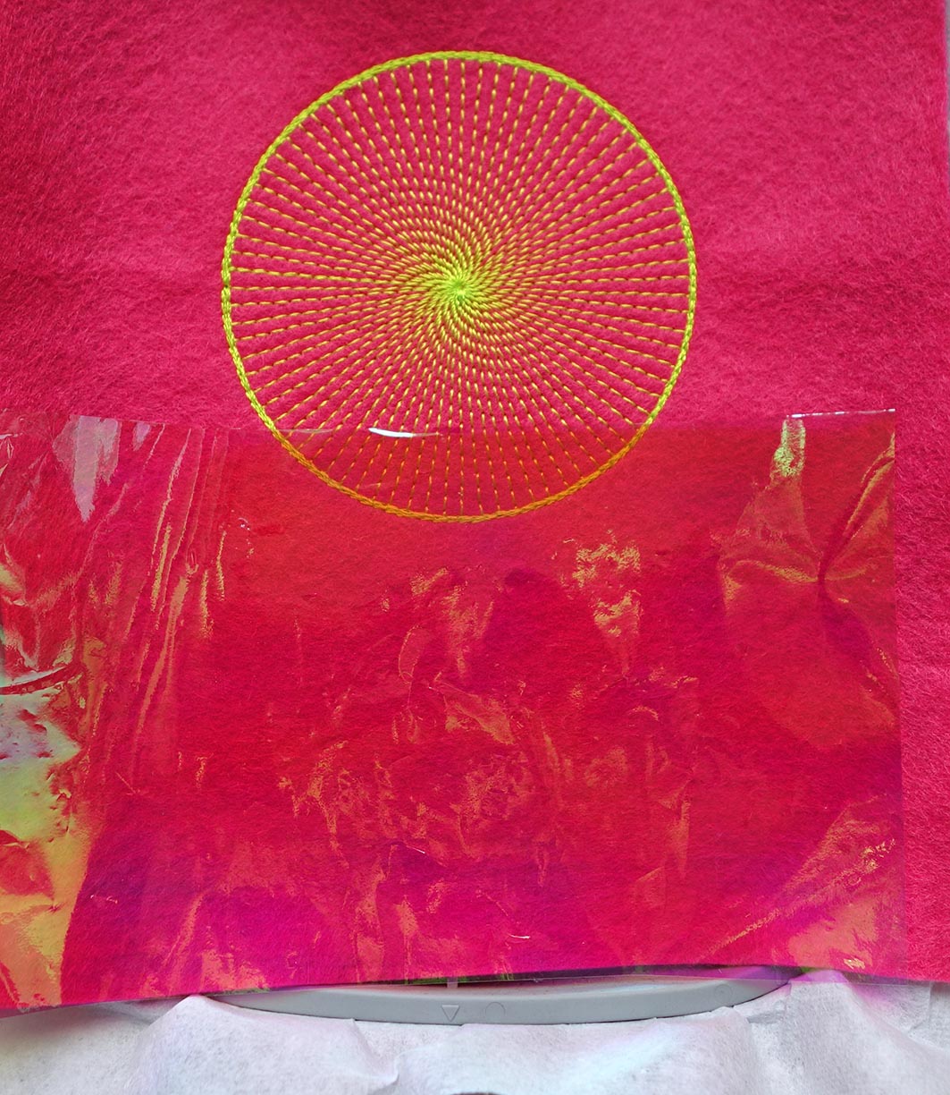 Stickvlies einspannen und Filz auflegen. Die erste Farbe stickt den Kreis.