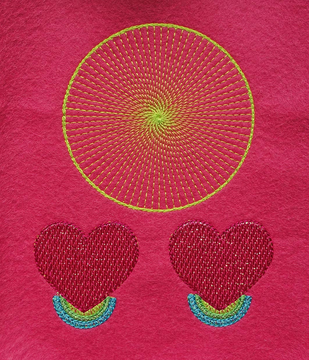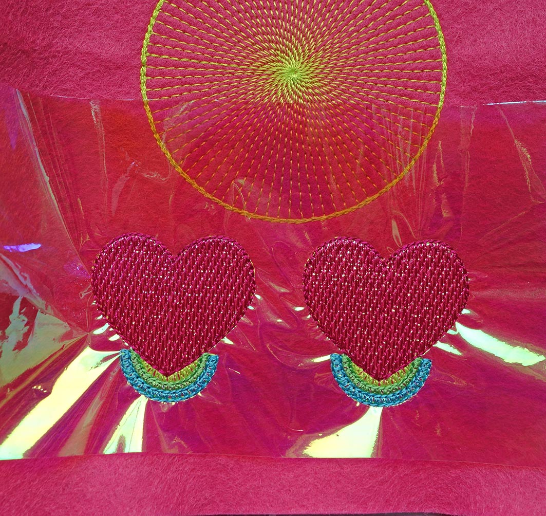 Lege ein Stück Stickfolie über die Herzen und sticke sie laut der Farblagen. Anschließend kannst Du die Folie abreißen.