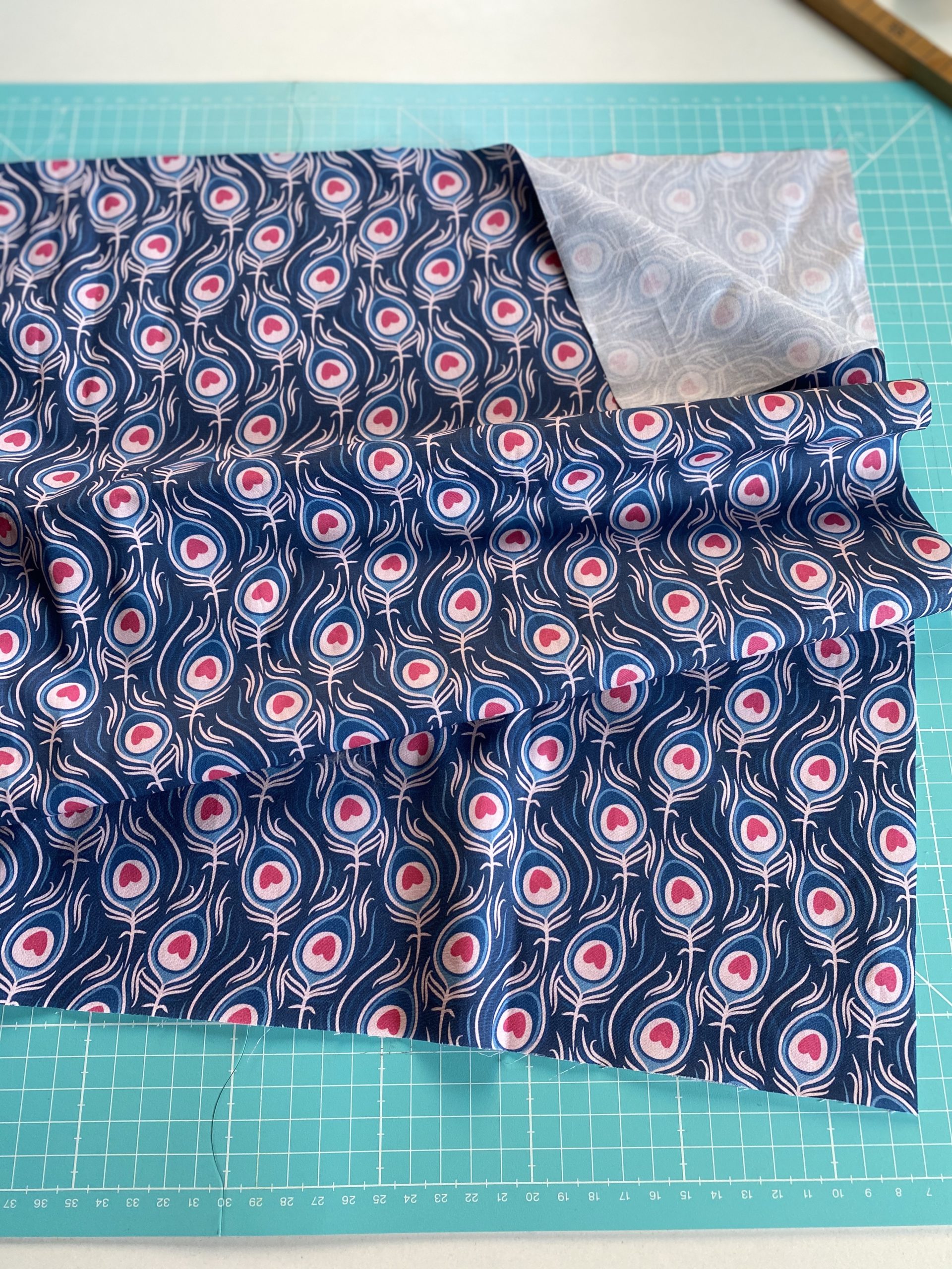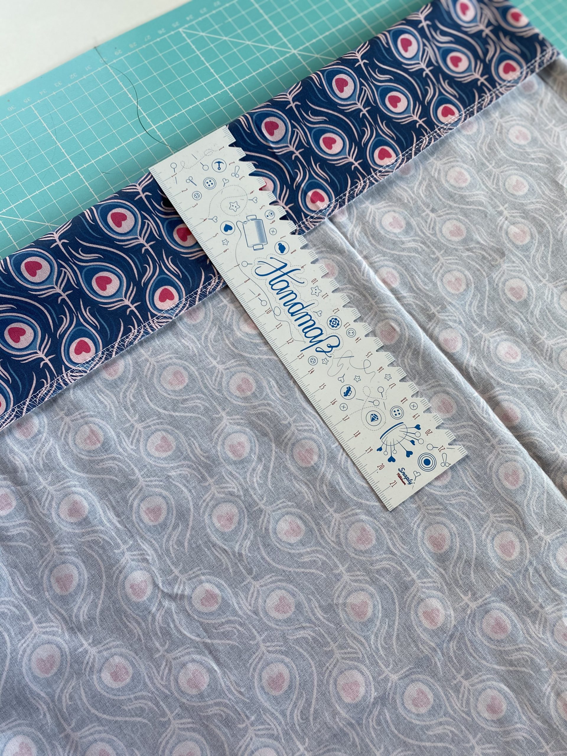Anschließend faltet Ihr das obere Ende nach innen. Der Umbruch kommt nach 1 cm NZG + 2,5 cm Tunnel + 4 cm Paperbag = 7,5 cm. Bügel die Falte gut und steppt die beiden Stoffe aufeinander.