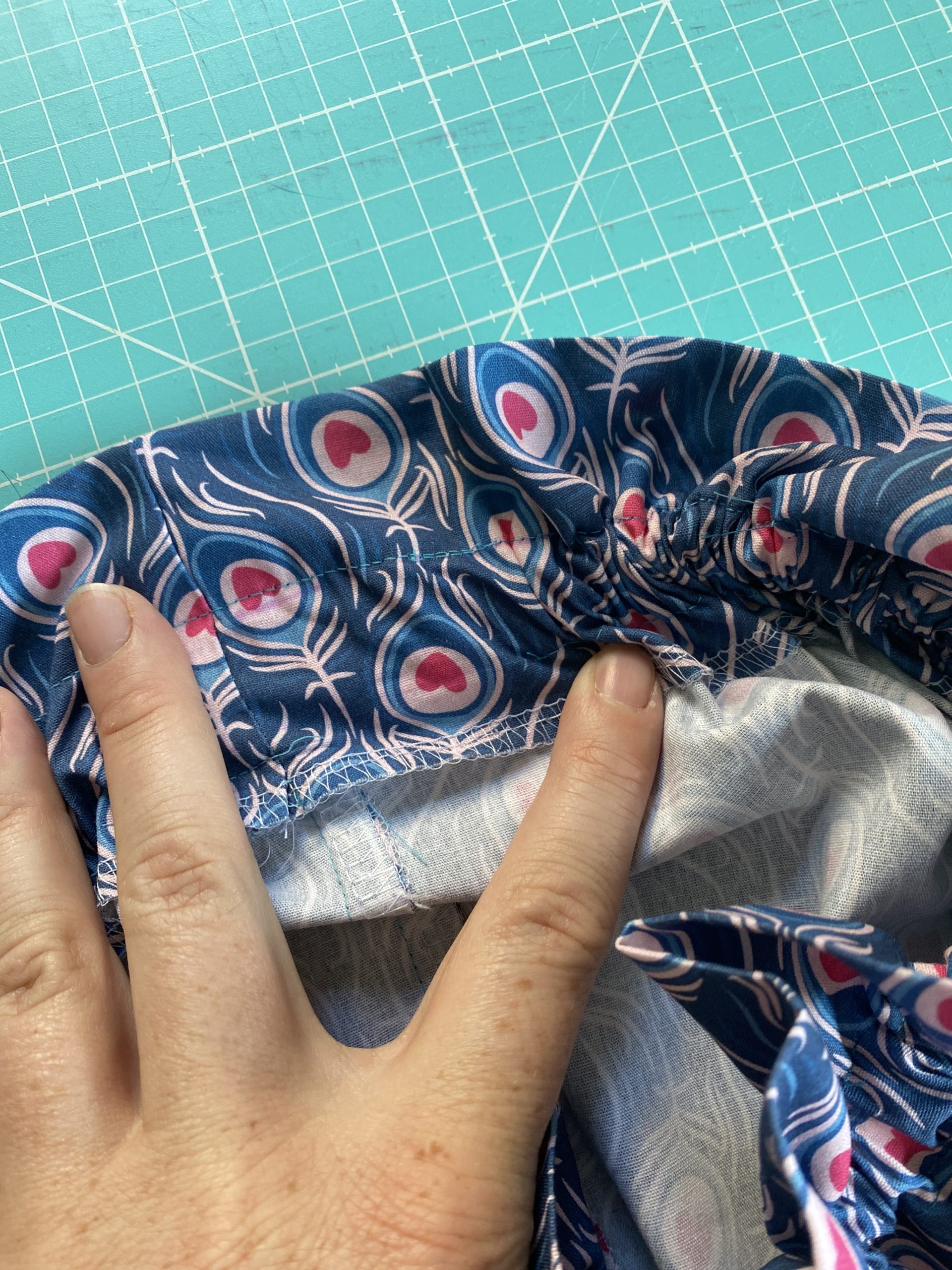 Nun steppt Ihr eine zweite Naht 2,5 cm unterhalb der ersten und lasst dabei eine Öffnung, um das Gummiband einzuziehen.