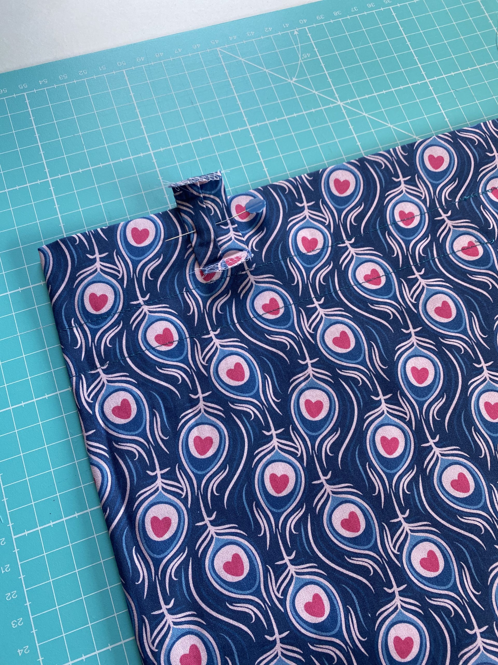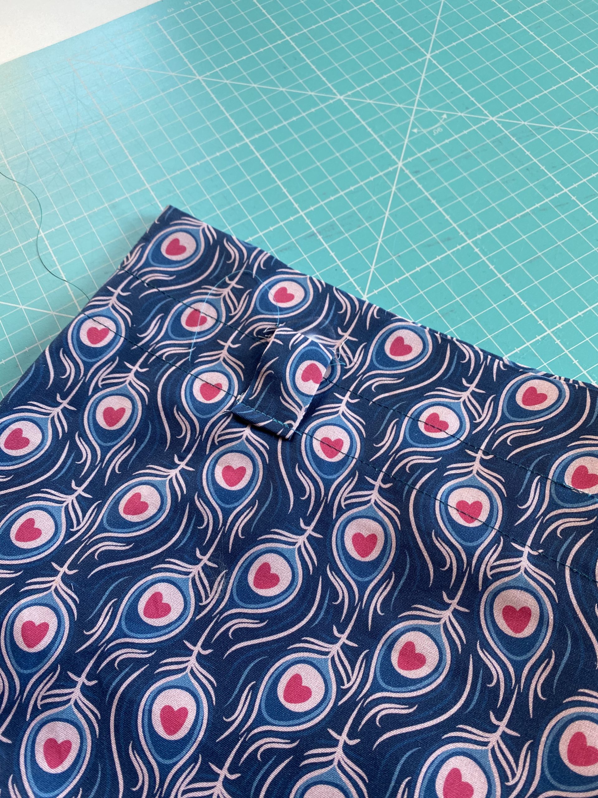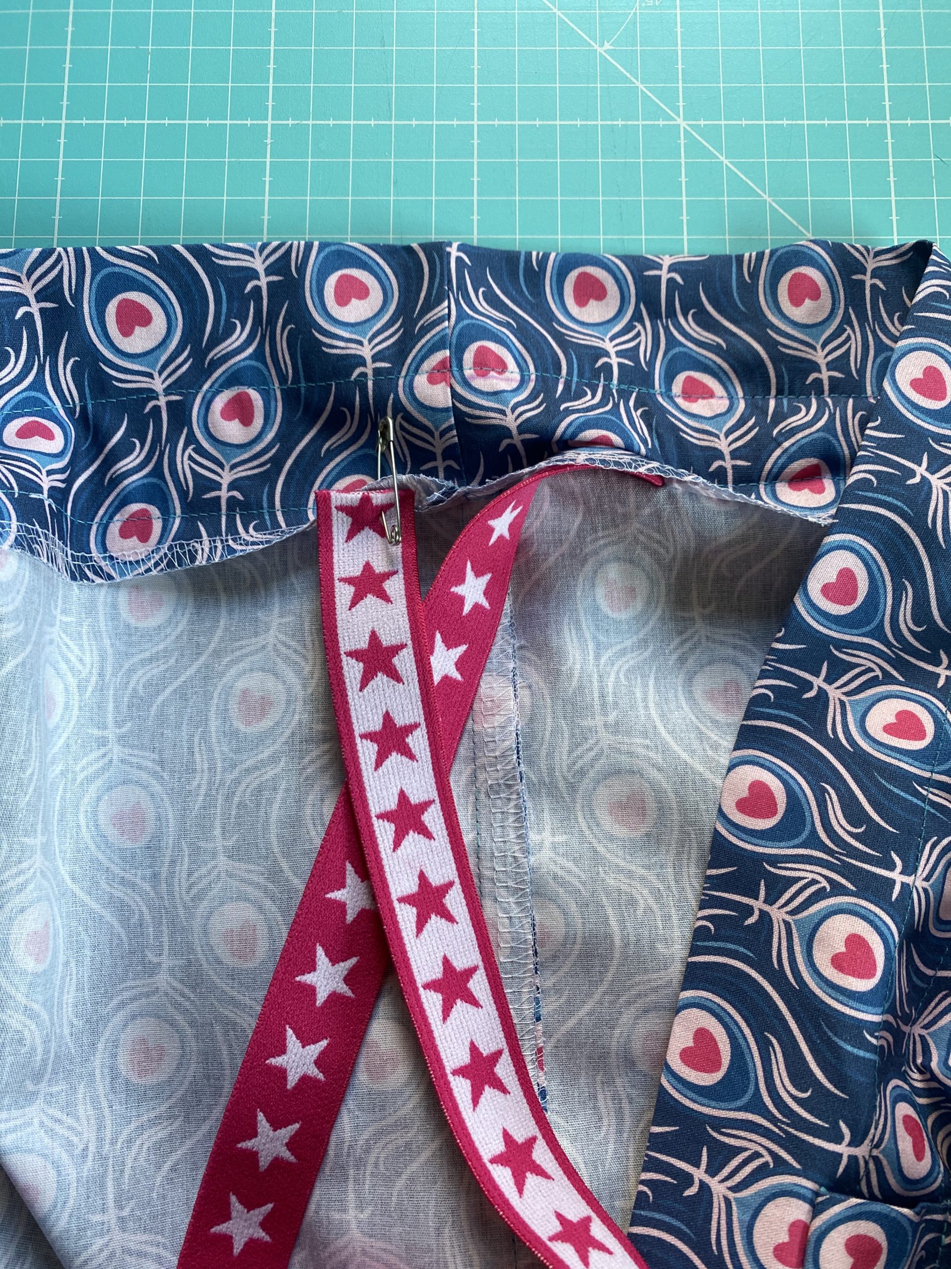 Legt die Schlaufen oberhalb des Gummitunnels rechts auf rechts, sie zeigen nach oben und steppt diese fest. Dann klappt Ihr sie nach unten und näht diese unterhalb des Gummitunnels fest.