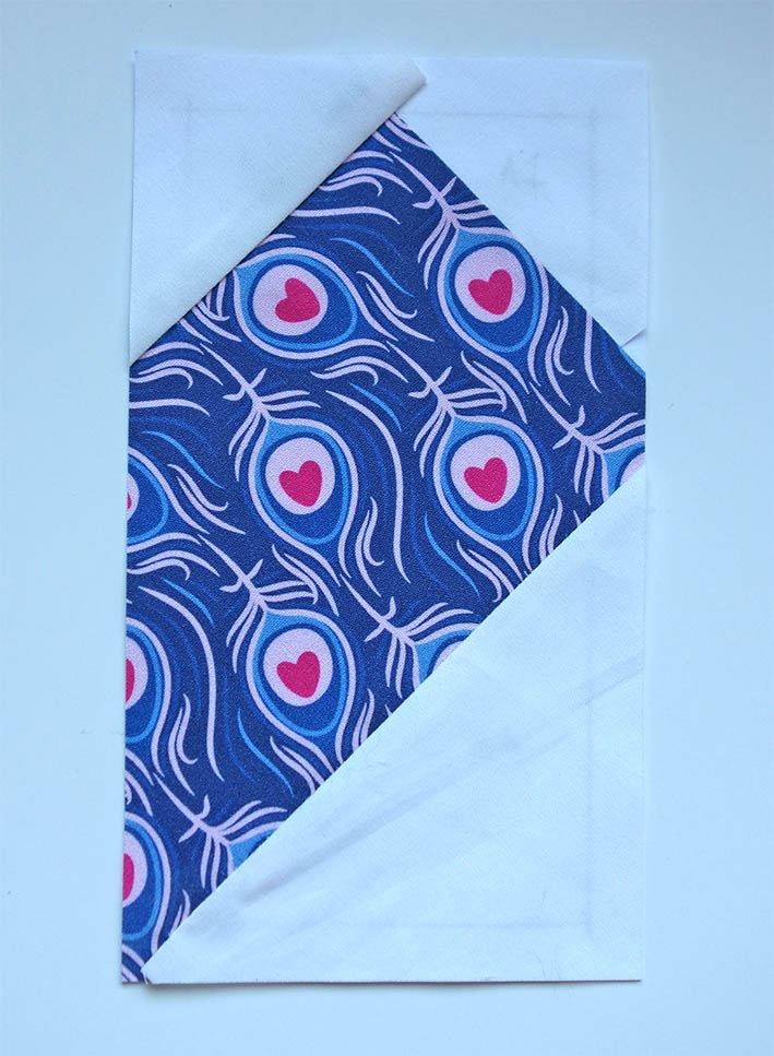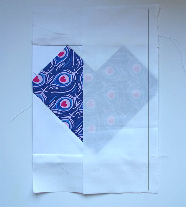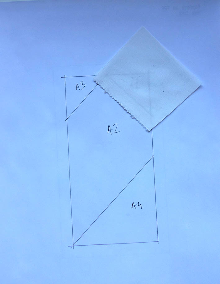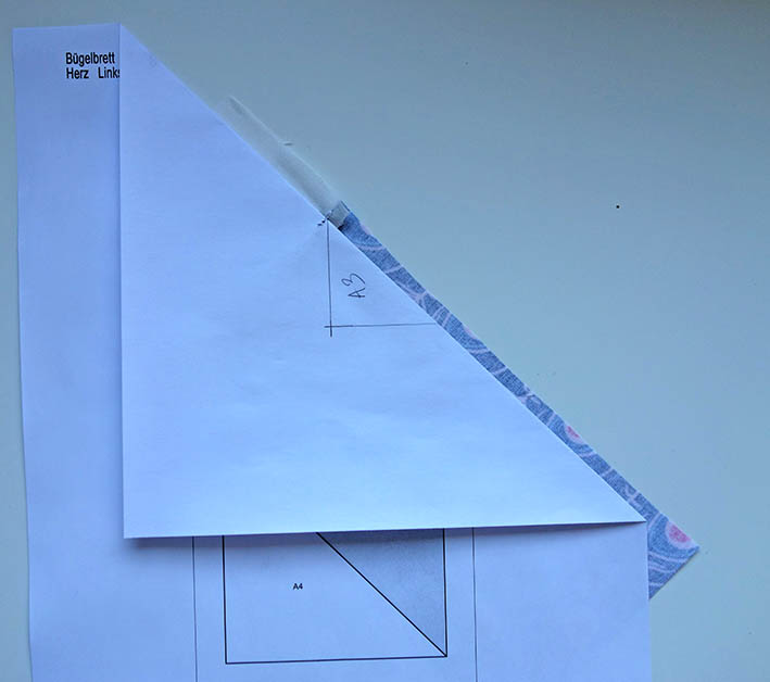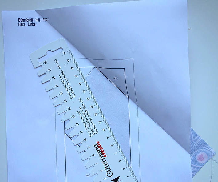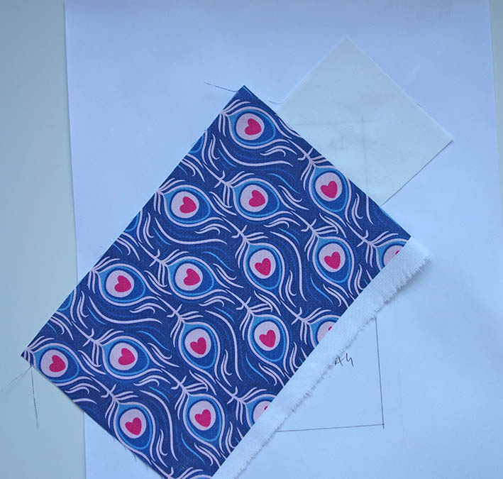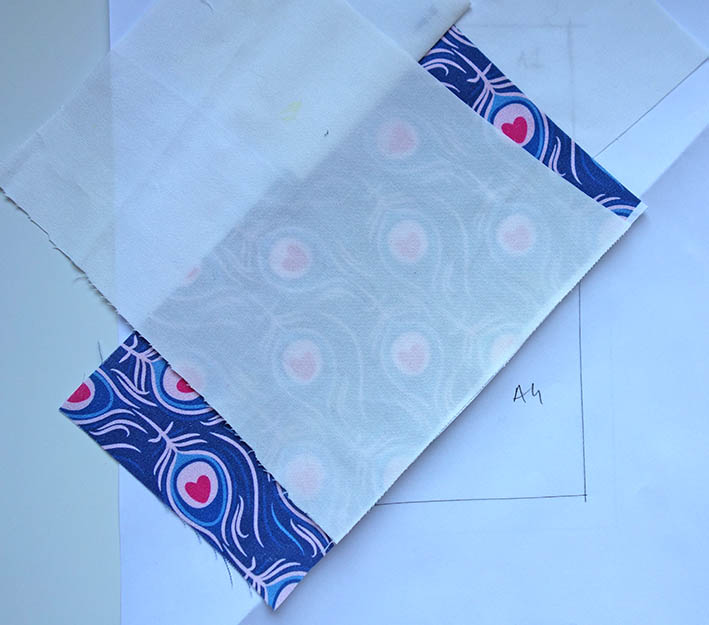 Papier wieder umdrehen, Stoff A4 rechts auf rechts anlegen und auf der rechten Papierseite die Linie A4 nähen.