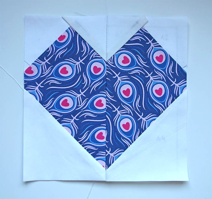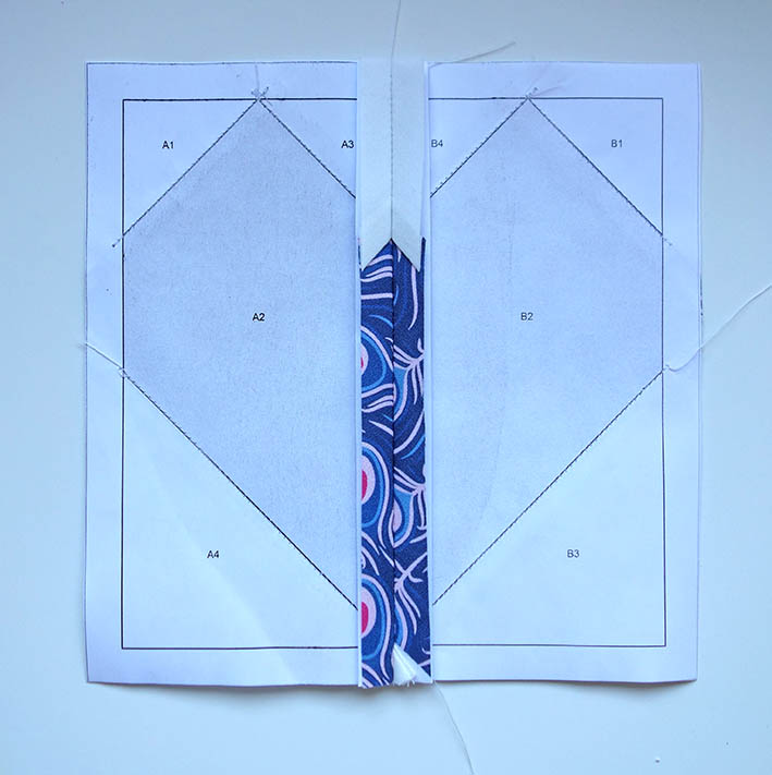 Beide Teile rechts auf rechts aufeinanderlegen, dabei liegen A3 und A4 aufeinander. Die Kante nähen und die Nahtzugabe auseinander bügeln. Das Papier bleibt noch dran, und wird erst später entfernt.
