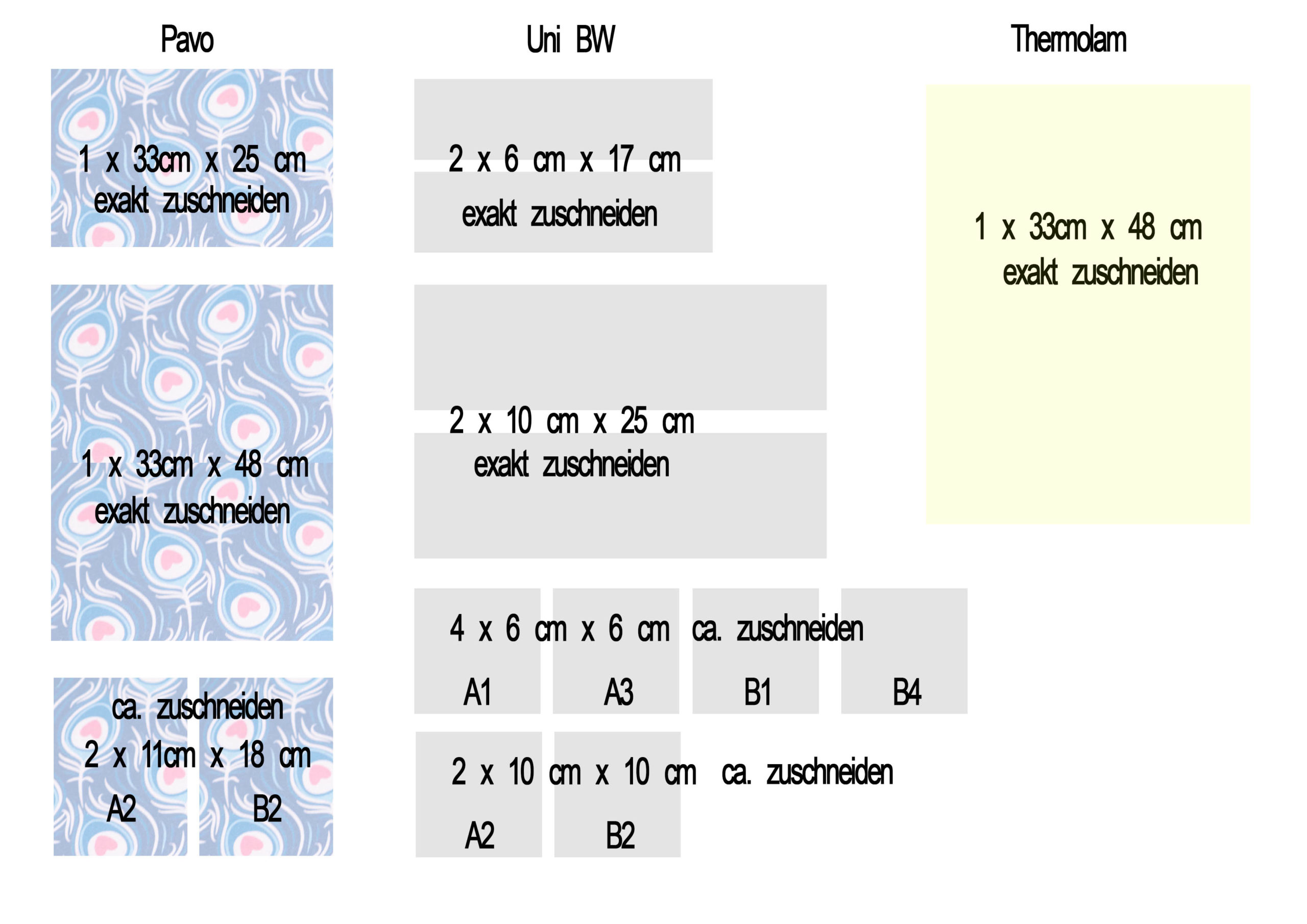 Die Vorlage ohne Skalierung ausdrucken. Ich zeige Euch wie die linke Seite, also Vorlage 1, gearbeitet wird. Hierzu brauchen wir die Zuschnitte A1 bis A4 (siehe Zuschneideplan).