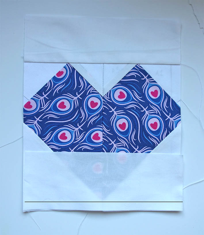 Nähe den 6 cm x 17 cm Streifen jeweils an der oberen und unteren Kante des FPP Blockes an. Bügle die Nahtzugaben nach außen (obere Kante nach oben, untere Kante nach unten)