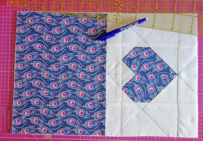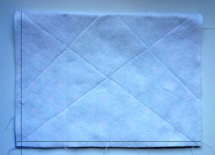 Lege den Zuschnitt auf das Thermolam und überlege Dir, wie Du das gute Stück absteppen möchtest. Ich habe mir geometrische Linien entlang der zusammengenähten Kanten angezeichnet. Steppe die Markierungen mit einem 3 mm langen Geradstich ab.