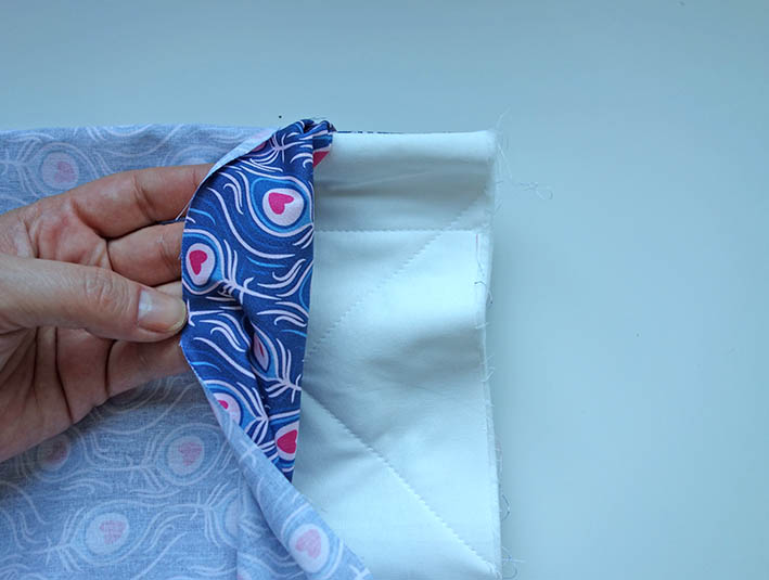 Lege das Teil rechts auf rechts in die Hälfte und nähe die Seite und untere Kante. Schneide das Thermolam innerhalb der Nahtzugaben zurück, und schneide die unteren Ecken schräg ab. Das machen wir damit die Kanten/Nähte nicht zu dick werden. Wende auf die rechte Seite und bügle den Bezug.